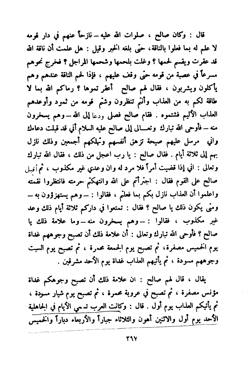 قومه حتى وقف عليهم، فإذا لحم الناقة عندهم وهم يأكلون ويشربون، فقال لهم صالح أعقرتموها؟ رماكم الله بما لا طاقة لكم به من العذاب وأنتم تنظرون وشتم قومه من ثمود وأوعدهم العذاب الأليم فشتموه. فقام صالح فصلى ودعا إلى الله - وهم يسخرون منه - فأوحى الله تبارك وتعالى إلى صالح عليه السلام إني قد قبلت دعاءك واني مرسل عليهم صيحة تزهق أنفسهم وتهلكهم أجمعين وذلك نازل بهم إلى ثلاثة أيام. فقال صالح: يا رب أعجل من ذلك، فقال الله تبارك وتعالى: إني إذا قضيت أمراً فلا مرد له وإن وعدي غير مكذوب، ثم أقبل صالح على القوم فقال: اجترأتم على الله وانتهكتم حرمته فانتظروا نقمته واعلموا أن العذاب نازل بكم بما فعلتم، فقالوا: - وهم يستهزئون به - ومتى يكون ذلك يا صالح؟ فقال: تمتعوا في داركم ثلاثة أيام ذلك وعد غير مكذوب، فقالوا: - وهم يسخرون منه - وما علامة ذلك يا صالح؟ فأوحى الخميس مصفرة، ثم تصبح يوم الجمعة محمرة، ثم تصبح يوم السبت وجوههم مسودة، ثم يأتيهم العذاب غداة يوم الأحد مشرقين.