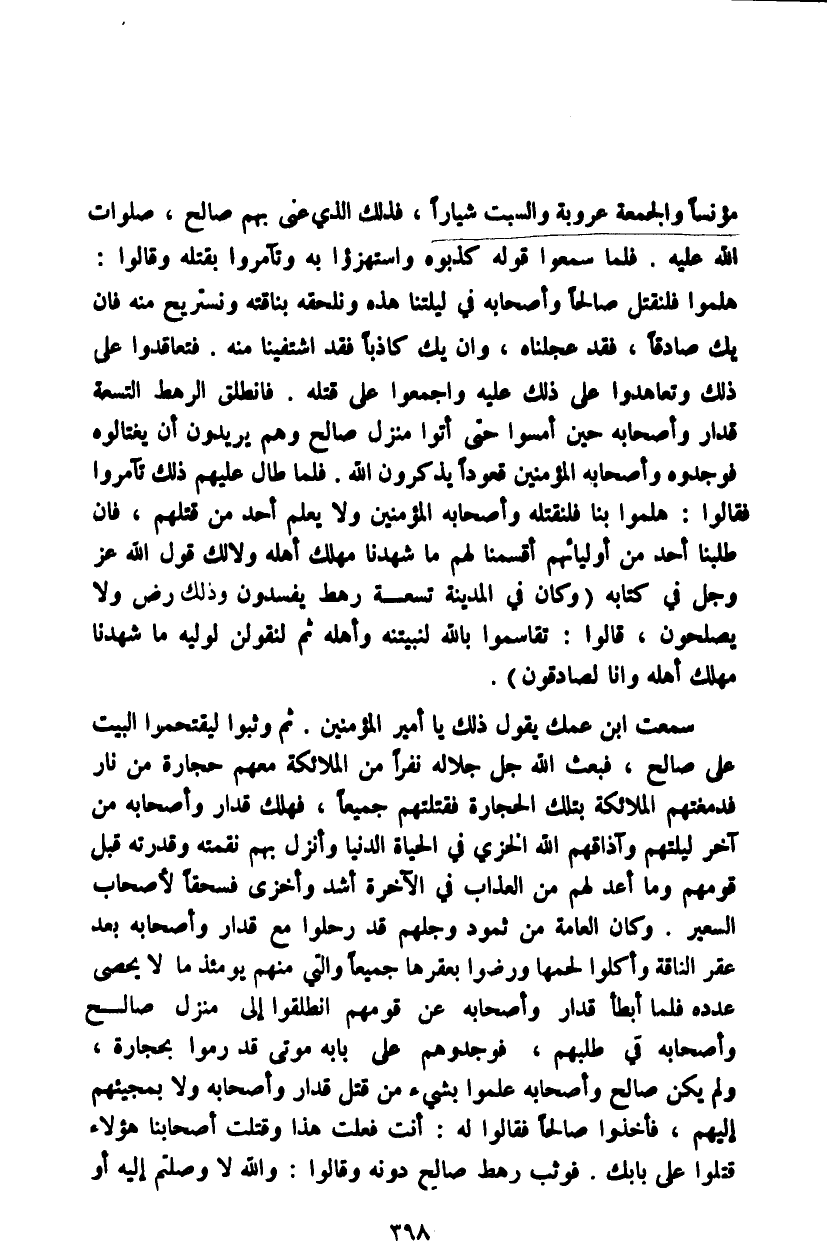 سمعت ابن عمك يقول ذلك يا أمير المؤمنين. ثم وثبوا ليقتحموا البيت على صالح، فبعث الله جل جلاله نفراً من الملائكة معهم حجارة من نار فدمغتهم الملائكة بتلك الحجارة فقتلتهم جميعاً، فهلك قدار وأصحابه من آخر ليلتهم وأذاقهم الله الخزي في الحياة الدنيا وأنزل بهم نقمته وقدرته قبل قومهم وما أعد لهم من العذاب في الآخرة أشد وأخزى فسحقاً لأصحاب السعير. وكان العامة من ثمود وجلهم قد رحلوا مع قدار وأصحابه بعد عقر الناقة وأكلوا لحمها ورضوا بعقرها جميعاً والتي منهم يومئذ ما لا يحصى عدده فلما أبطأ قدار وأصحابه عن قومهم انطلقوا إلى منزل صالح وأصحابه في طلبهم، فوجدوهم على بابه موتى قد رموا بحجارة، ولم يكن صالح وأصحابه علموا بشيء من قتل قدار وأصحابه ولا بمجيئهم إليهم، فأخذوا صالحاً فقالوا له: أنت فعلت هذا وقتلت أصحابنا هؤلاء قتلوا على بابك. فوثب رهط صالح دونه وقالوا: والله لا وصلتم إليه أو