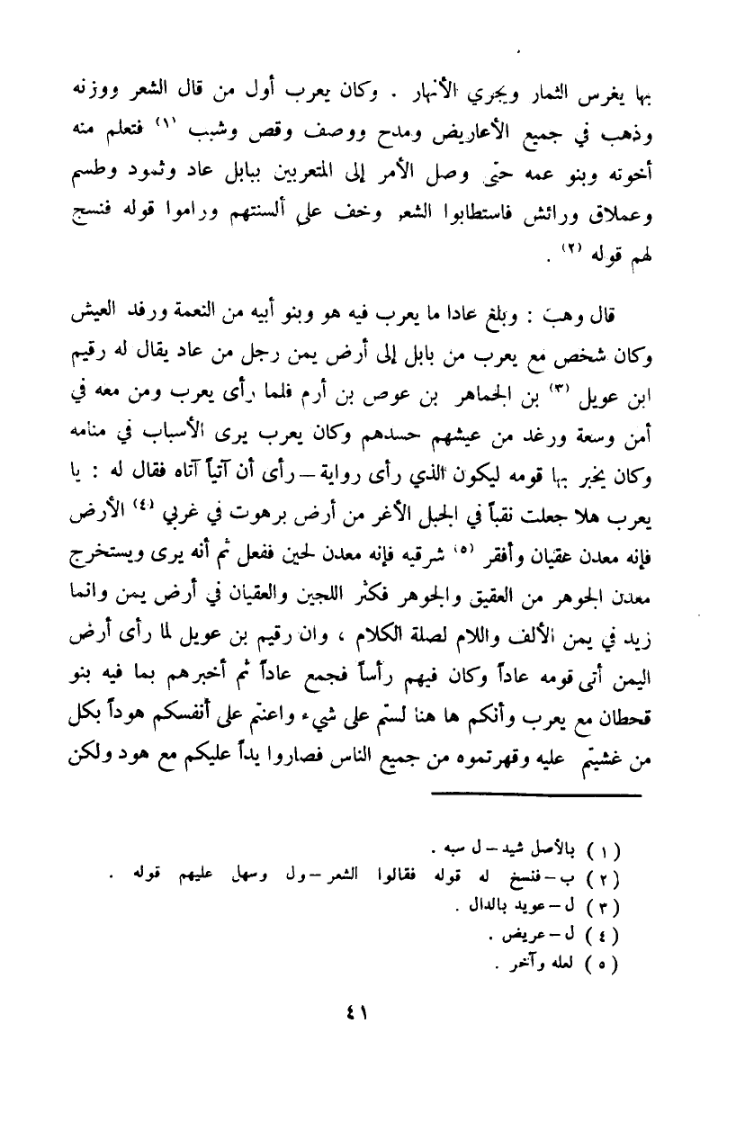 اللجين والعقيان في أرض يمن وإنما زيد في يمن الألف واللام لصلة الكلام، وإن رقيم بن عويل لما رأى أرض اليمن أتى قومه عاداً وكان فيهم رأساً فجمع عاداً ثم أخبرهم بما فيه بنو قحطان مع يعرب وأنكم ها هنا لستم على شيء وأعنتم على أنفسكم هوداً بكل من غشيم عليه وقهرتموه من جميع الناس فصاروا يداً عليكم مع هود ولكن