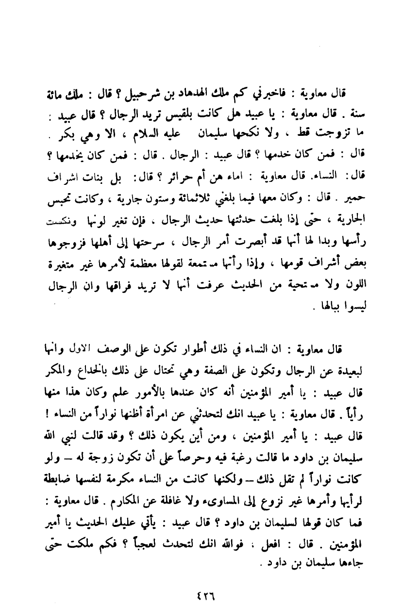 قال معاوية: إن النساء في ذلك أطوار تكون على الوصف الأول وإنها لبعيدة عن الرجال وتكون على الصفة وهي تحتال على ذلك بالخداع والمكر قال عبيد: يا أمير المؤمنين إنه كان عندها بالأمور علم وكان هذا منها رأياً. قال معاوية: يا عبيد انك لتحدثني عن امرأة أظنها نواراً من النساء! قال عبيد: يا أمير المؤمنين، ومن أين يكون ذلك؟ وقد قالت لنبي الله سليمان بن داود ما قالت رغبة فيه وحرصاً على أن تكون زوجة له - ولو كانت نواراً لم تقل ذلك - ولكنها كانت من النساء مكرمة لنفسها ضابطة لرأيها وأمرها غير نزوع إلى المساوئ ولا غافلة عن المكارم. قال معاوية: فما كان قولها لسليمان بن داود؟ قال عبيد: يأتي عليك الحديث يا أمير المؤمنين. قال: افعل. فوالله انك لتحدث لعجباً؟ فكم ملكت حتى جاءها سليمان بن داود.