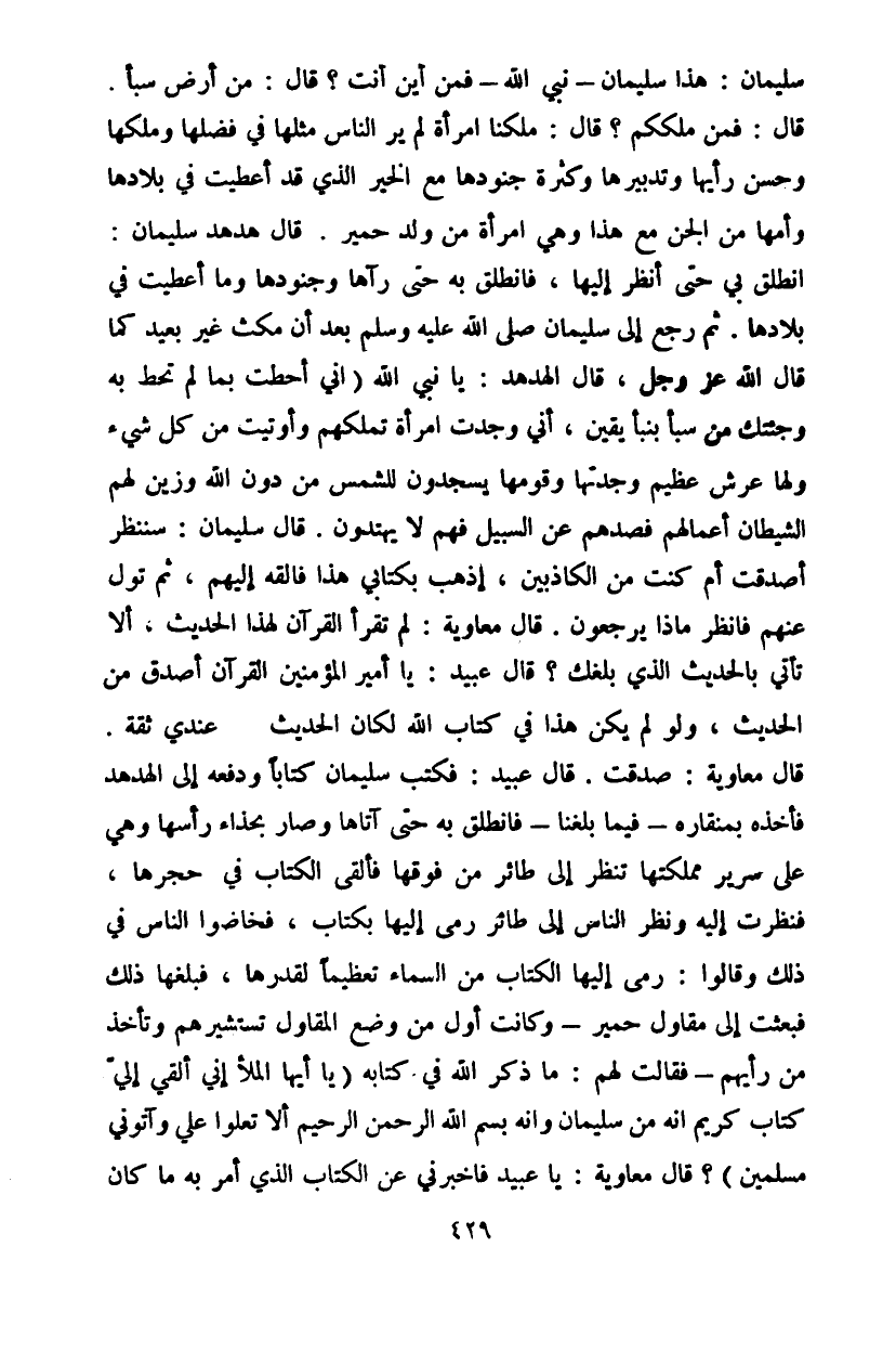 سليمان: هذا سليمان - نبي الله - فمن أين أنت؟ قال: من أرض سبأ. قال: فمن ملككم؟ قال: ملكنا امرأة لم ير الناس مثلها في فضلها وملكها وحسن رأيها وتدبيرها وكثرة جنودها مع الخير الذي قد أعطيت في بلادها وأمها من الجن مع هذا وهي امرأة من ولد حمير. قال هدهد سليمان: انطلق بي حتى أنظر إليها، فانطلق به حتى رآها وجنودها وما أعطيت في بلادها. ثم رجع إلى سليمان صلى الله عليه وسلم بعد أن مكث غير بعيد كما قال الله عز وجل، قال الهدهد: يا نبي الله أني {أحطت بما لم تحط به وجئتك من سبأ بنبأ يقين، أني وجدت امرأة تملكهم وأوتيت من كل شيء لها عرش عظيم وجدتها وقومها يسجدون للشمس من دون الله وزين لهم الشيطان أعمالهم فصدهم عن السبيل فهم لا يهتدون. قال سليمان: سننظر أصدقن أم كنت من الكاذبين، اذهب بكتابي هذا فالقه إليهم، ثم تول عنهم فانظر ماذا يرجعون}. قال معاوية: لم نقرأ القرآن لهذا الحديث، إلا تأتي بالحديث الذي بلغك؟ قال عبيد: يا أمير المؤمنين القرآن أصدق من الحديث، ولو لم يكن هذا في كتاب الله لكان الحديث عندي ثقة. قال معاوية: صدقت. قال عبيد: فكتب سليمان كتاباً ودفعه إلى الهدهد فأخذه بمنقاره - فيما بلغنا - فانطلق به حتى آتاها وصار بحذاء رأسها وهي على سرير مملكتها تنظر إلى طائر من فوقها فألقى الكتاب في حجرها، فنظرت إليه ونظر الناس إلى طائر رمى إليها بكتاب، فخاضوا الناس في ذلك