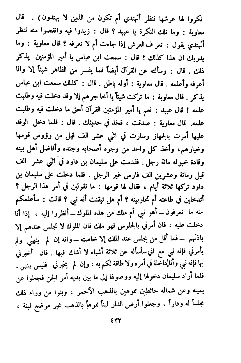 نكروا لها عرشها ننظر أتهتدي أم تكون من الذين لا يهتدون}. قال معاوية: وما تلك النكرة يا عبيد؟ قال: زيدوا فيه وانقصوا منه ننظر أتهتدي يقول: تعرف العرش إذا جاءت أم لا تعرفه؟ قال معاوية: وما يدريك إن هذا كذلك؟ قال: سمعت ابن عباس يا أمير المؤمنين يذكر ذلك. قال: وسألته عن القرآن أيضاً فما يفسر من الظاهر شيئاً إلا وأنا أعرفه وأعلمه. قال معاوية: أوله باطن. قال: كذلك سمعت ابن عباس يذكر. قال معاوية: ما تركت شيئاً يا أخا جرهم إلا وقد دخلت فيه وطلبت علمه! قال عبيد: نعم يا أمير المؤمنين القرآن أحق ما دخلت فيه وطلبت علمه. قال معاوية: صدقت، فخذ في حديثك. قال: فلما دخل الوفد عليها أمرت بالجهاز وسارت في اثني عشر ألف قيل من رؤوس قومها وخيارهم، وأخذ كل واحد من وجوه أصحابه وجنده وأفاضل أهل بيته وقادة خيوله مائة رجل. فقدمت على سليمان بن داود في اثني عشر ألف قيل ومائة وعشرين ألف فارس غير الرجل. فلما دخلت على سليمان بن داود تركها ثلاثة أيام، فقال لها قومها: ما تقولين في أمر هذا الرجل؟ أتدخلين في طاعته أن تحاربينه؟ أم هل تيقنت إنه نبي؟ قالت: سأعلمكم منه ما تعرفون - أهو نبي أم ملك من هذه الملوك - أنظروا إليه، إذا أنا دخلت عليه، فإن أمرني بالجلوس فهو ملك فإن الملوك لا تجلس عندهم إلا بإذنهم - فما أقل من يجلس عند الملك إلا خاصته - وإنه إن لم ينهني ولم يأمرني فإنه نبي مع إني سأسأله عن ثلاثة أشياء لا أشك فيها. فإن أخبرني بها فإنه نبي وأنا داخلة ولا طاقة لكم به، وإن لم يخبرني فليس بنبي. فلما أراد سليمان دخولها إليه ووصولها إلى ما بين يديه أمر الجن فجعلوا عن يمينه وعن شماله حائطين مموهين بالذهب الأحمر، وبنوا من وراء ذلك مجلساً له وداراً، وجعلوا الدار لبناً مموهاً بالذهب غير موضع لبنة،