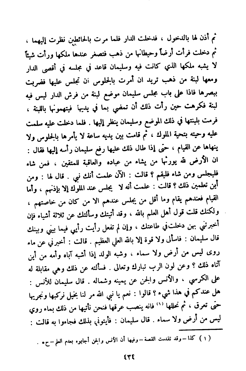 أرضاً وحيطانها من ذهب فتصعر عندها ملكها ورأت شيئاً لا يشبه ملكها الذي كانت فيه وسليمان قاعد في مجلسه في أقصى الدار ومعها لبنة من ذهب تريد إن أمرت بالجلوس أن تجلس عليها فضربت ببصرها فإذا على باب مجلس سليمان موضع لبنة من فرش الدار ليس فيه لبنة فكرهت حين رأت ذلك أن تمضي بما في يديها فيتهمونها باللبنة، فرمت بلبنتها في ذلك الموضع وسليمان ينظر إليها. فلما دخلت عليه سلمت عليه وحيته بتحية الملوك، ثم قامت بين يديه ساعة لا يأمرها بالجلوس ولا ينهاها عن القيام، حتى إذا طال ذلك عليها رفع سليمان رأسه إليها فقال: إن الأرض لله يورثها من يشاء من عباده والعاقبة للمتقين، فمن شاء فليجلس ومن شاء فليقم؟ قالت: الآن علمت أنك نبي. قال لها: ومن أين تعلمت ذلك؟ قالت: علمت إنه لا يجلس عند الملوك إلا بإذنهم، وأما القيام فعندهم يقام وما أقل من يجلس عندهم إلا من كان من خاصتهم، ولكنك قلت قول أهل العلم بالله، وقد أتيتك وسألتك عن ثلاثة أشياء فإن أخبرتني بهن دخلت في طاعتك، وإن لم تفعل رأيت رأيي فيما بني وبينك قال سليمان: فاسألي ولا قوة إلا بالله العلي العظيم. قالت: أخبرني عن ماء روى ليس من ارض ولا سماء، وشبه الولد إذا أشبه أباه وأمه من أين آتاه ذلك؟ وعن لون الرب تبارك وتعالى. فسألته عن ذلك وهي مقابلة له على الكرسي، والأنس والجن عن يمينه وشماله. فقال سليمان للأنس: هل عندكم في هذا شيء؟ قالوا: نعم يا نبي الله مر لنا بخيل نركبها ونجربها حتى تعرق، ثم نحللها فإنه ينصب عرقها فنحن نأتيها من ذلك بماء روي ليس من أرش ولا سماء. قال سليمان: فأيتوني بذلك فجاءوا به قالت: