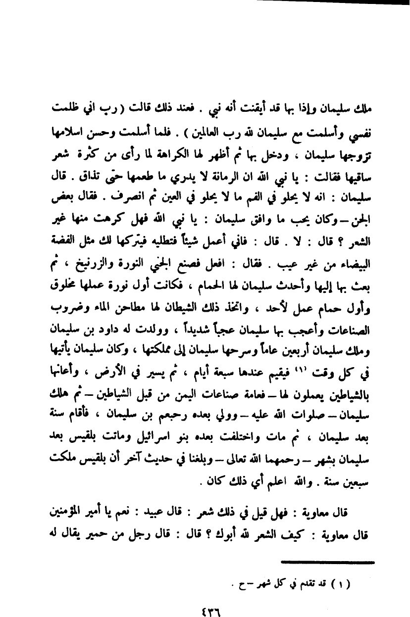 وافق سليمان: يا نبي الله فهل كرهت منها غير الشعر؟ قال: لا. قال: فاني أعمل شيئاً فتطلبه فيتركها لك مثل الفضة البيضاء من غير عيب. فقال: افعل فصنع الجني النورة والزرنيخ، ثم بعث بها إليها وأحدث سليمان لها الحمام، فكانت أول نورة علمها مخلوق وأول حمام عمل لأحد، واتخذ ذلك الشيطان لها مطاحن الماء وضروب الصناعات وأعجب بها سليمان عجبا شديداً، وولدت له داو بن سليمان وملك سليمان أربعين عاماً وسرحها سليمان إلى مملكتها، وكان سليمان يأيتها في كل وقت فيقيم عندها سبعة أيام، ثم يسير في الأرض، وأعانها بالشياطين يعملون لها - فعامة صناعات اليمن من قبل الشياطين - ثم هلك سليمان - صلوات الله عليه - وولي بعده رحبعم بن سليمان، فأقام بعد سليمان، ثم مات واختلفت بعده ينو إسرائيل وماتت بلقيس بعد سليمان بشهر - رحمهما الله تعالى - وبلغنا في حديث آخر أن بلقيس ملكت سبعين سنة. والله أعلم أي ذلك كان.