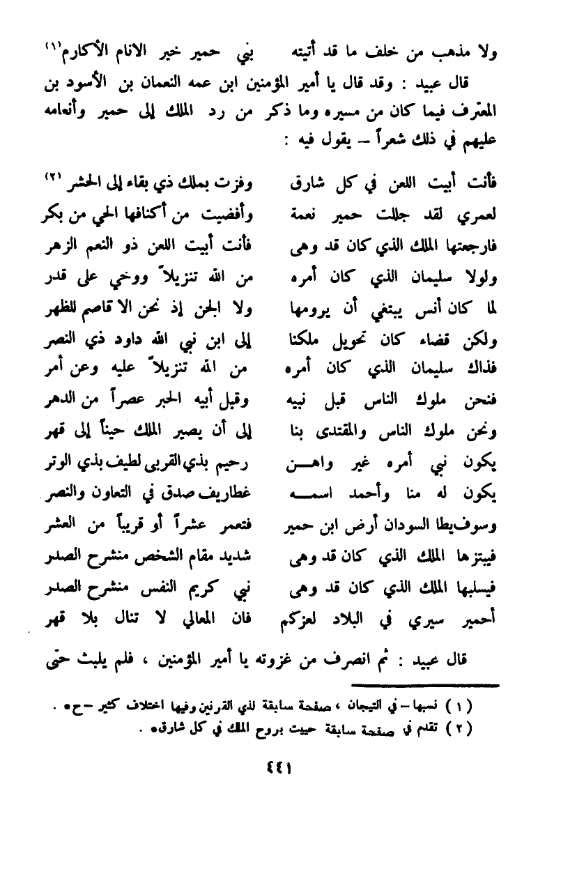 قال عبيد: وقد قال يا أمير المؤمنين ابن عمه النعمان بن الأسود بن المعترف فيما كان من مسيره وما ذكر من رد الملك إلى حمير وأنعامه عليهم في ذلك شعراً - يقول فيه: