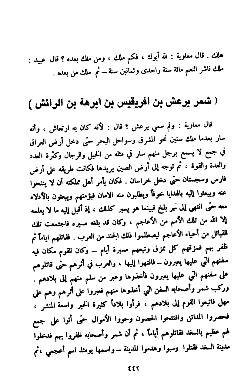 قال معاوية: ولم سمي يرعش؟ قال: لأنه كان به ارتعاش، وأنه سار بعدما ملك سنين نحو المشرق وسواحل البحر دخل أرض العراق في جمع لا يسمع برجل منهم سار في مثله من الخيل والرجال وكثرة العدد والعدة والقوة، ثم توجه إلى أرض الصين يريدها فكانت طريقه على أرض فارس وسجستان حتى دخل خراسان. فكان يأمر أهل مملكته أن لا يتنحوا عنه ويبعثوا إليه بالهدايا خوفاً ويطلبون منه الأمان فيؤمنهم ويبعثون بالأدلاء معه حتى انتهى إلى نهر بلخ فبينما هو يسير كذلك، إذ أقبل إليه ما لا يعلمه إلا الله من تلك الأمم من الأعاجم، وكان قد بلغه مسيره فاجتمعت تلك القبائل من أحياء الأعاجم ليصطلموا ذلك الجند من العرب. فقاتلهم أياماً ثم ظفر بهم فمزقهم كل ممزق وتبعهم مسيرة أيام - وكان للقوم مكان فيه سفنهم التي عليها يعبرون - فانتهوا إليها، والعرب في أثرهم حتى قاتلوهم على سفنهم التي عليها يعبرون فأخذوها وعبر من سلم منهم إلى بلادهم. وركب شمر وأصحابه السفن التي أخذوها منهم فعبروا على أثرهم وهم على مهل فاتبعوا القوم إلى بلادهم، فرأوا بلاداً كثيرة الخير واسعة المنشر، فحضروا المدائن وافتتحوا الحصون وحووا الأموال حتى أتوا على جمع لهم عظيم بالسغد فقاتلوهم أياماً، ثم أن شمر وأصحابه ظفروا بهم فدخلوا مدينة السغد فقتلوا وسبوا وهدموا المدينة - واسمها يومئذ اسم أعجمي، ثم