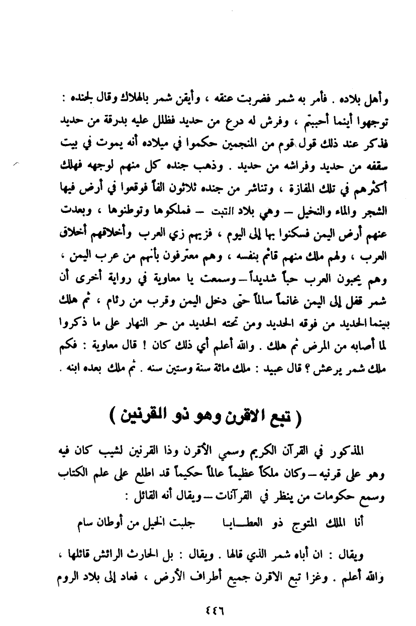 وأهل بلاده. فأمر به شمر فضربت عنقه، وأيقن شمر بالهلاك وقال لجنده: توجهوا أينما أحببتم، وفرش له درع من حديد فظلل عليه بدرقة من حديد فذكر عند ذلك قول قوم من المنجمين حكموا في ميلاده إنه يموت في بيت شقفه من حديد وفراشه من حديد. وذهب جنده كل منهم لوجهه فهلك أكثرهم في تلك المفازة، وتناشر من جنده ثلاثين ألفاً فوقعوا في أرض فيها الشجر والماء والنخيل - وهي بلاد التبت - فملكوها وتوطنوها، وبعدت عنهم أرض اليمن فسكنوا بها إلى اليوم، فزيهم زي العرب وأخلاقهم أخلاق العرب، ولهم ملك منهم قائم بنفسه، وهم معترفون بأنهم من عرب اليمن، وهم يحبون العرب حباً