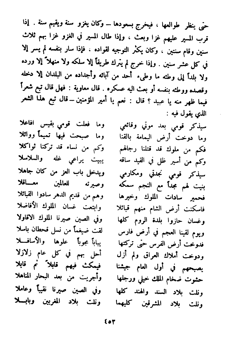 حتى ينظر طوالعها، فيخرج بسعودها - وكان يغزو سنة ويقيم سنة. إذا قرب المسير عليهم غزا وبعث، وإذا طال المسير في الغزو غزا بهم ثلاث سنين وقام سنتين، وكان يكثر التوجيه لقواده، فإذا سار بنفسه لم يسر إلا في كل عشر سنين. وإذا خرج لم يترك طريقاً إلا سلكه ولا منهلاً إلا ورده ولا بلداً إلى وطئه وما وطئ أحد من آبائه وأجداده من البلدان إلا دخله وقصده ووطئه بنفسه أو بعث إليه عسكره. قال معاوية: فهل قال تبع شعراً فيما ظهر منه يا عبيد؟ قال: نعم يا أمير المؤمنين - قال تبع هذا الشعر الذي يقول فيه: