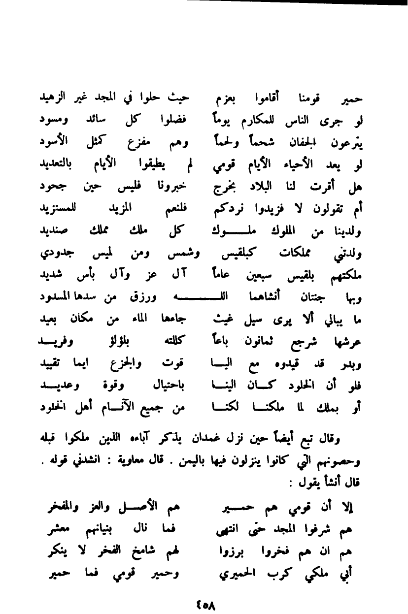 وقال تبع أيضاً حين نزل غمدان يذكر آباءه الذين ملكوا قبله وحصونهم التي كانوا ينزلون فيها باليمن. قال معاوية: أنشدني قوله. قال أنشأ يقول: