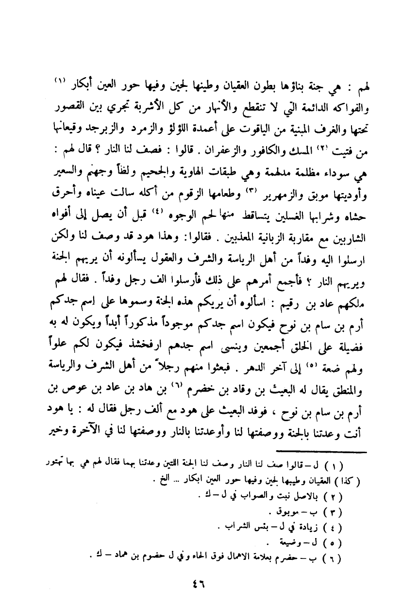 لهم: هي جنة بناؤها بطون العقيان وطينها لجين وفيها حور العين أبكار والفواكه الدائمة التي لا تنقطع والأنهار من كل الأشربة تجري بين القصور تحتها والغرف المبنية من الياقوت على أعمدة اللؤلؤ والزمرد والزبرجد وقيعانها من فتيت المسك والكافور والزعفران. قالوا: فصف لنا النار؟ قال لهم: هي سوداء مظلمة مدلهمة وهي طبقات الهاوية والحجيم ولظاً وجهنم والسعير وأوديتها موبق والزمهرير وطعامها الزقوم من أكله سالت عيناه وأحرق حشاه وشرابها الغسلين يتساقط منها لحم الوجوه قبل أن يصل إلى أفواه الشاربين مع مقاربة الزبانية المعذبين. فقالوا وهذا هود قد وصف لنا ولكن أرسلوا إليه وفداً من أهل الرياسة والشرف والعقول يسألونه أن يريهم الجنة ويريهم النار؟ فأجمع أمرهم على ذلك فأرسلوا ألف رجل وفداً. فقال لهم ملكهم عاد بن رقيم: اسألوه أن يريكم هذه الجنة وسموها على اسم جدكم أرم بن سام بن نوح فيكون اسم جدكم موجوداً مذكوراً أبداً ويكون له به فضيلة على الخلق أجمعين وينسى اسم جدهم ارفخشد فيكون لكم علواً ولهم ضعة إلى آخر الدهر. فبعثوا منهم رجلاً من أهل الشرف والرياسة والمنطق يقال له البعيث بن وقاد بن خضرم بن هاد بن عاد بن عوص بن أرم بن سام بن نوح، فوفد البعيث على هود مع ألف رجل فقال له: يا هود أنت وعدتنا بالجنة ووصفتها لنا وأوعدتنا بالنار ووصفتها لنا في الآخرة