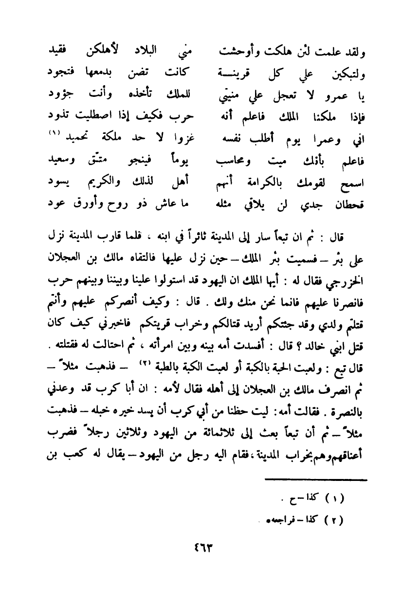 قال: ثم أن تبعاً سار إلى المدينة ثائراً في ابنه، فلما قرب المدينة نزل على بضر - فسميت بئر الملك - حين نزل عليها فالتقاه مالك بت العجلان الخزرجي فقال له: أيها الملك إن اليهود قد استولوا علينا وبيننا وبينهم حرب فانصرنا عليهم فإنما نحن منك ولك. قال: وكيف أنصركم عليهم وأنتم قتلتم ابني خالد؟ قال: أفسدت أمه بينه وبين امرأته، ثم احتالت له فقتلته. قال تبع: ولعبت الحبة بالكبة أو لعبت الكبة بالطبة فذهبت مثلاً - ثم انصرف مالك بن العجلان إلى أهله فقال لأمه: إن أبا كرب قد وعدني بالنصرة. فقالت أمه: ليت حظنا من أبي كرب أن يسد خيره خبله - فذهبت مثلاً - ثم أن تبعاً بعث إلى ثلاثمائة من اليهود وثلاثين رجلاً فضرب أعناقهم وهم بخراب المدينة فقام إليه رجل من اليهود - يقال له كعب بن
