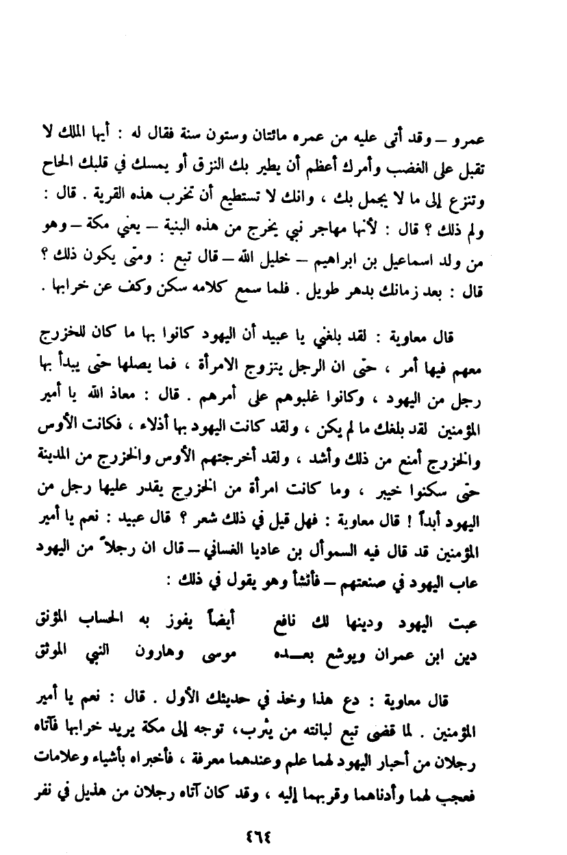 قال معاوية: دع هذا وخذ في حديثك الأول. قال: نعم يا أمير المؤمنين. لما قضى تبع لبانته من يثرب، توجه إلى مكة يريد خرابها فآتاه رجلان من أحبار اليهود لهما علم وعندهما معرفة، فأخبراه بأشياء وعلامات فعجب لهما وأدناهما وقربهما إليه، وقد كان آتاه رجلان من هذيل في نفر