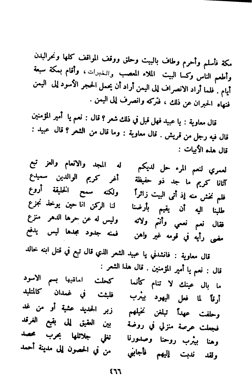 قال معاوية: يا عبيد فهل قيل في ذلك شعر؟ قال: نعم يا أمير المؤمنين قال فيه رجل من قريش. قال معاوية: وما قال من الشعر؟ قال عبيد: قال هذه الأبيات: