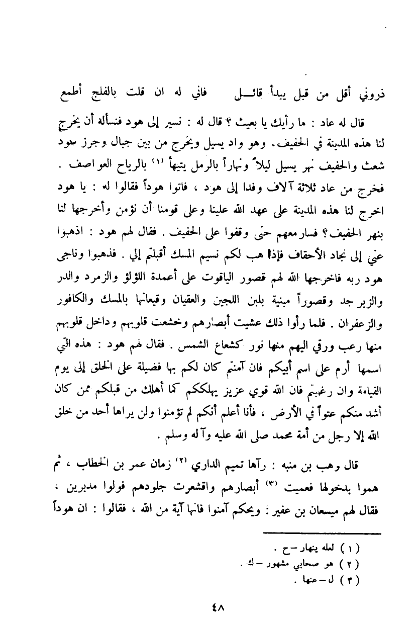 والحفيف نهر يسير ليلاً ونهاراً بالرمل يتيهأ بالرياح العواصف. فخرج من عاد ثلاثة آلاف وفدا إلى هود، فاتوا هوداً فقالوا له: يا هود اخرج لنا هذه المدينة على عهد الله علينا وعلى قومنا أن نؤمن وأخرجها لنا بنهر الحفيف؟ فسار معهم حتى وقفوا على الحفيف. فقال لهم هود: اذهبوا عني إلى نجاد الأحقاف فإذا هب لكم نسيم المسك أقبلتم إلي. فذهبوا وناجى هود ربه فأخرجها الله لهم قصور الياقوت على أعمدة اللؤلؤ والزمرد والدر والزبر جد وقصوراً مبنية بلبن اللجين والعقيان وقيعانها بالمسك والكافور والزعفران. فلما رأوا ذلك عشيت أبصارهم وخشعت قلوبهم وداخل قلوبهم منها رعب ورقي إليهم منها نور كشعاع الشمس. فقال لهم هود: هذه التي اسمها أرم على أسم أبيكم فإن آمنتم كان لكم بها فضيلة على الخلق إلى يوم القيامة وإن رغبتم فإن الله قوي عزيز يهلككم كما أهلك من قبلكم ممن كان أشد منكم عتواً في الأرض، فأنا أعلم أنكم لم تؤمنوا ولن يراها أحد من خلق الله إلا رجل من أمة محمد صلى الله عليه وآله وسلم.