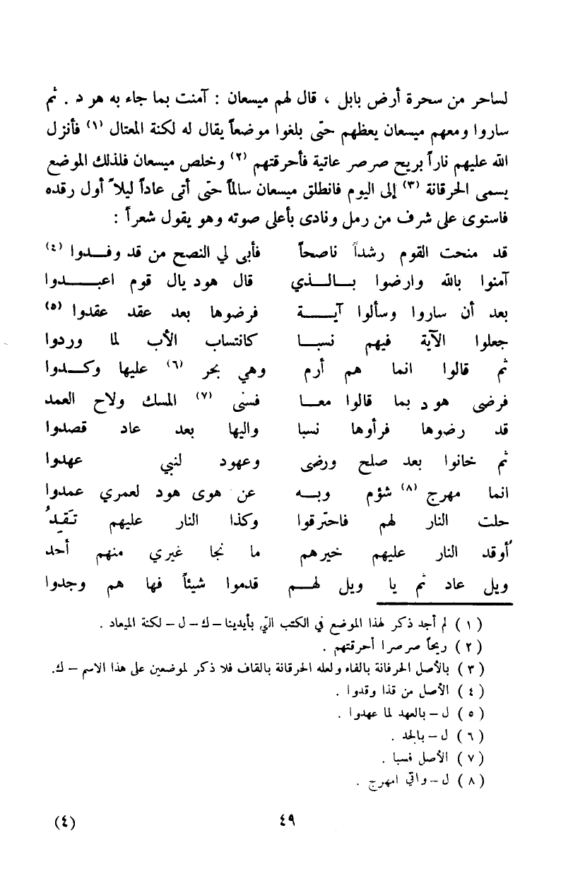 لساحر من سحرة أرض بابل، قال لهم ميسعان: آمنت بما جاء به هود، ثم ساروا ومعهم ميسعان يعظهم حتى بلغوا موضعاً يقال له لكنة المعتال فأنزل الله عليهم ناراً بريح صرصر عاتية فأحرقتهم وخلص ميسعان فلذلك الموضع يسمى الحرقانهة إلى اليوم فانطلق ميسعان سالماً حتى أتى عاداً ليلاً أول رقده فاستوى على شرف من رمل ونادى بأعلى صوته وهو يقول شعراً: