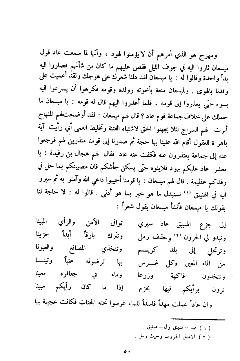 ومهرج هو الذي أمرهم أن لا يؤمنوا لهود، وأنها لما سمعت عاد ميسعان ثاروا عليه في جوف الليل فقص عليهم ما كان من شأنهم فصاروا إليه يداً واحدة وقالوا له: يا ميسعان لقد دلنا شعرك على هوجك ولقد أعميت على وفدنا بالهوى. ولميسعان منعة بأخوته وولده وقومه فكرهوا أن يسرعوا إليه بسوء حتى يعذروا إلى قومه، فلما أعذروا إليهم قال له قومه: يا ميسعان ما حملك على خلاف جماعة قوم عاد؟ قال لهم ميسعان: لقد أوضحت لهم المنهاج أنرت لهم السراج لئلا يجهلوا الحق لاشتباه الفتنة وتخليط العمى أني رأيت آية باهرة للعقول أقام الله علينا بها حجة ثم صدرنا إلى قومنا منذرين لهم فرجعوا عنه إلى جماعة يعتذرون عنه فكفت عنه عاد فقال لهم هجال بن رفيدة: يا معشر عاد عليكم بهود فلاينوه حتى يسكن جأشكم فإن مصيبتكم بما حل في وفدكم عظيمة. قال لهم ميسعان: يا قومنا أجيبوا داعي الله وآمنوا به ثم سيروا إليه في الهنيبق نستبدل ما هو خير بما هو أدنى. قالوا له: لا حاجة لنا بقولك يا ميسعان فأنشأ ميسعان يقول شعراً: