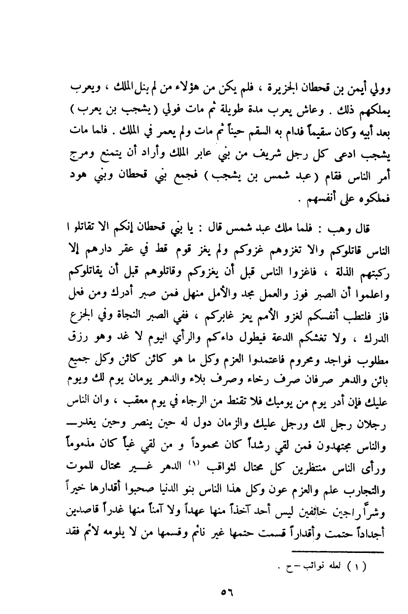 قال وهب: فلما ملك عبد شمس قال: يا بني قحطان إنكم ألا تقاتلوا الناس قاتلوكم وألا تغزوهم ولم يغز قوم قط في عقر دارهم إلا ركبتهم الذلة، فاغزوا الناس قبل أن يغزوكم وقاتلوهم قبل ان يقاتلوكم واعلموا أن الصبر فوز والعمل مجد والأمل منهل فمن صبر أدرك ومن فعل فاز فلتطب أنفسكم لغزو الأمم يعز غابركم، ففي الصبر النجاة وفي الجزع الدرك، ولا تغشكم الدعة فيطول داءكم والرأي اليوم لا غد وهو رزق مطلوب فواجد ومحروم فاعتمدوا العزم وكل ما هو كائن كائن وكل جميع بائن والدهر صرفان صرف رخاء وصرف بلاء والدهر يومان يوم لك ويوم عليك فإن أدر يوم من يوميك فلا تقنط من الرجاء في يوم معقب، وإن الناس رجلان رجل لك ورجل عليك والزمان دول له حين ينصر وحين يغدر - والناس مجتهدون فمن لقي رشداً كان محموداً ومن لقي غياً كان مذموماً ورأى الناس منتظرين كل محتال لثواقب الدهر غير محتال للموت والتجارب علم والعزم