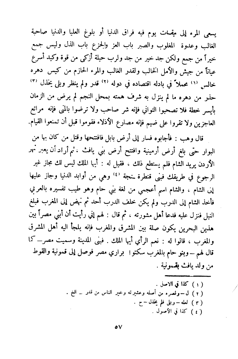 قال وهب: فأجابوه فسار إلى أرض بابل فافتتحها وقتل من كان بها من البوار حتى بلغ أرض أرمينية وافتتح أرض بني يافث، ثم أراد أن يعبر نهر الأردن يريد الشام فلم يستطع ذلك، فقيل له: إياها الملك ليس لك مجاز غير الرجوع في طريقك فبنى قنطرة سنجة وهي من أوابد الدنيا وجاز عليها إلى الشام، والشام اسم أعجمي من لغة حام وهو طيب تفسيره بالعربي فأخذ الشام إلى الدرب ولم يكن خلف الدرب أحد ثم نهض إلى المغرب فبلغ النيل فنزل عليه فدعا أهل مشورته، ثم قال: لهم إني رأيت أن أبني مصراً بين هذين البحرين يكون صلة بين المشرق والمغرب فإنه يلجأ إليه أهل المشرق والمغرب، قالوا له: نعم الرأي أيها الملك. فبنى المدينة وسميت مصر - كما قال لهم - وبنو حام بالمغرب سكنوا براري مصر فوصل إلى قمونية والقوط من ولد يافث بقمونية.