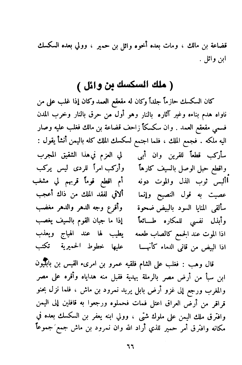 كان السكسك حازماً جلداً وكان له مقعقع العمد وكان إذا غلب على من ناوأه هدم بناءه وغير آثاره بالنار وهو أول من حرق بالنار وخرب المدن فسمي مقعقع العمد. وإن سكسكاً زاحف قضاعة بن مالك فغلب عليه وصار إليه ملكه. فجمع الملك، فلما اجتمع لسكسك الملك كله باليمن أنشأ يقول: