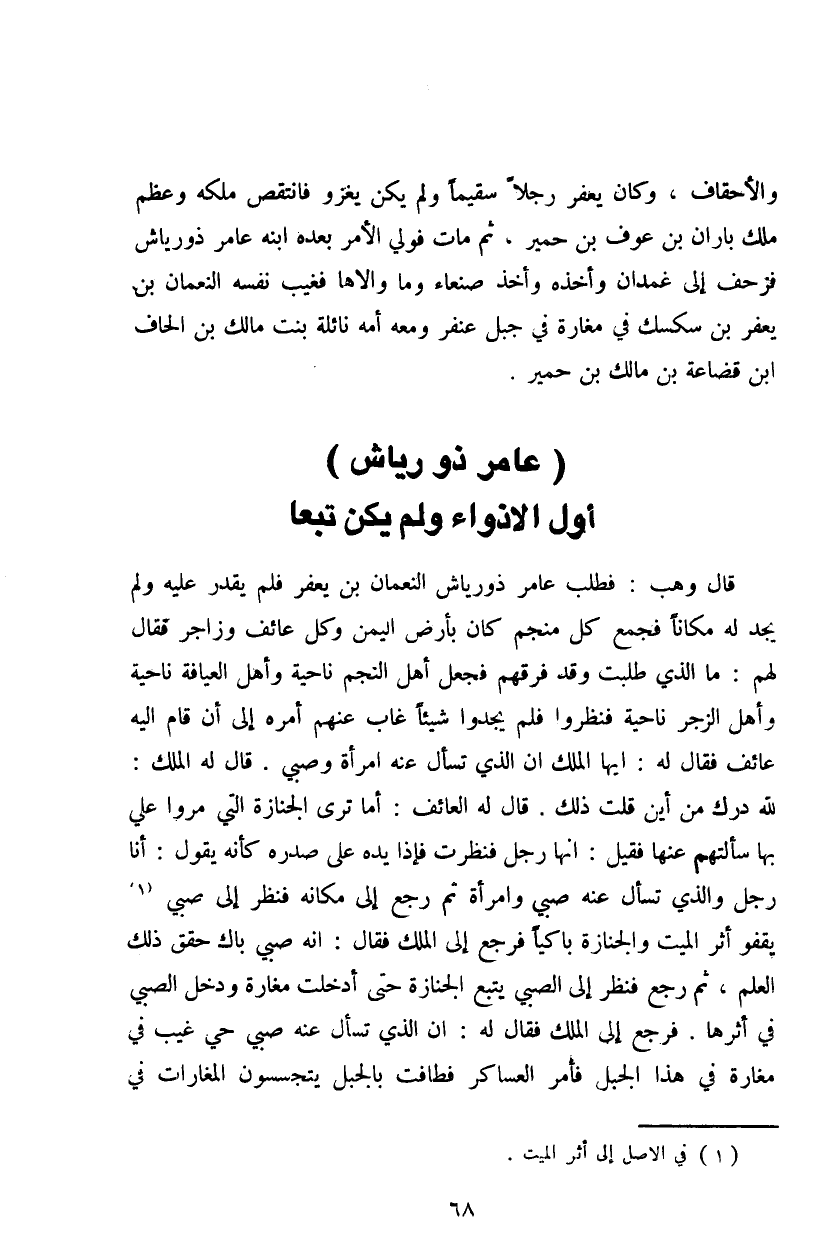 أول الاذواء ولم يكن تبعا، قال وهب: فطلب عامر ذو رياش النعمان بن يعفر فلم يقدر عليه ولم يجد له مكاناً فجمع كل منجم كان بأرض اليمن وكل عائف وزاجر