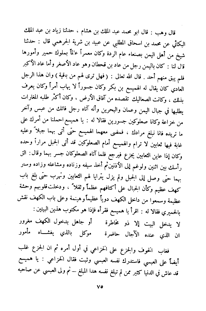 صعلوكين جسورين فقالا له: يا هميسع احملنا من أمرك على ما تريده فانا نبلغ مرادك، فمضى معهما الهمسيع حتى أتى بهما جبلاً وعليه غابة فيها ثعابين لا ترام الهميسع أمام الصعلوكين قد أتى الجبل مراراً وحده وكان إذا عاين الثعابين يجزع فيرجع فلما آتاه الصعلوكان جسر بهما وقال: الق رأسك بين اثنين ولو غم إلى الأذنين ثم أخذ سيفه وزناده ومشاعله وزاده وسار بهما حتى وصل إلى الجبل ولم يزل يترايا لهم الثعابين وتهرب حتى بلغ باب كهف عظيم وكأن الجبال على أكتافهم عظماً وثقلاً، ودخلت قلوبهم وحشة عظيمة وسمعوا من داخل الكهف دوياً عظيماً وخيمنة وعلى بابا الكهف نقش بالحميري فقالا له: اقرأ يا ميسع فقرأه فإذا هو مكتوب هذين البيتين: