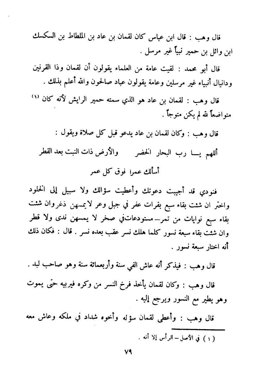 قال وهب: فيذكر إنه عاش ألفي سنة وأربعمائة سنة وهو صاحب لبد.