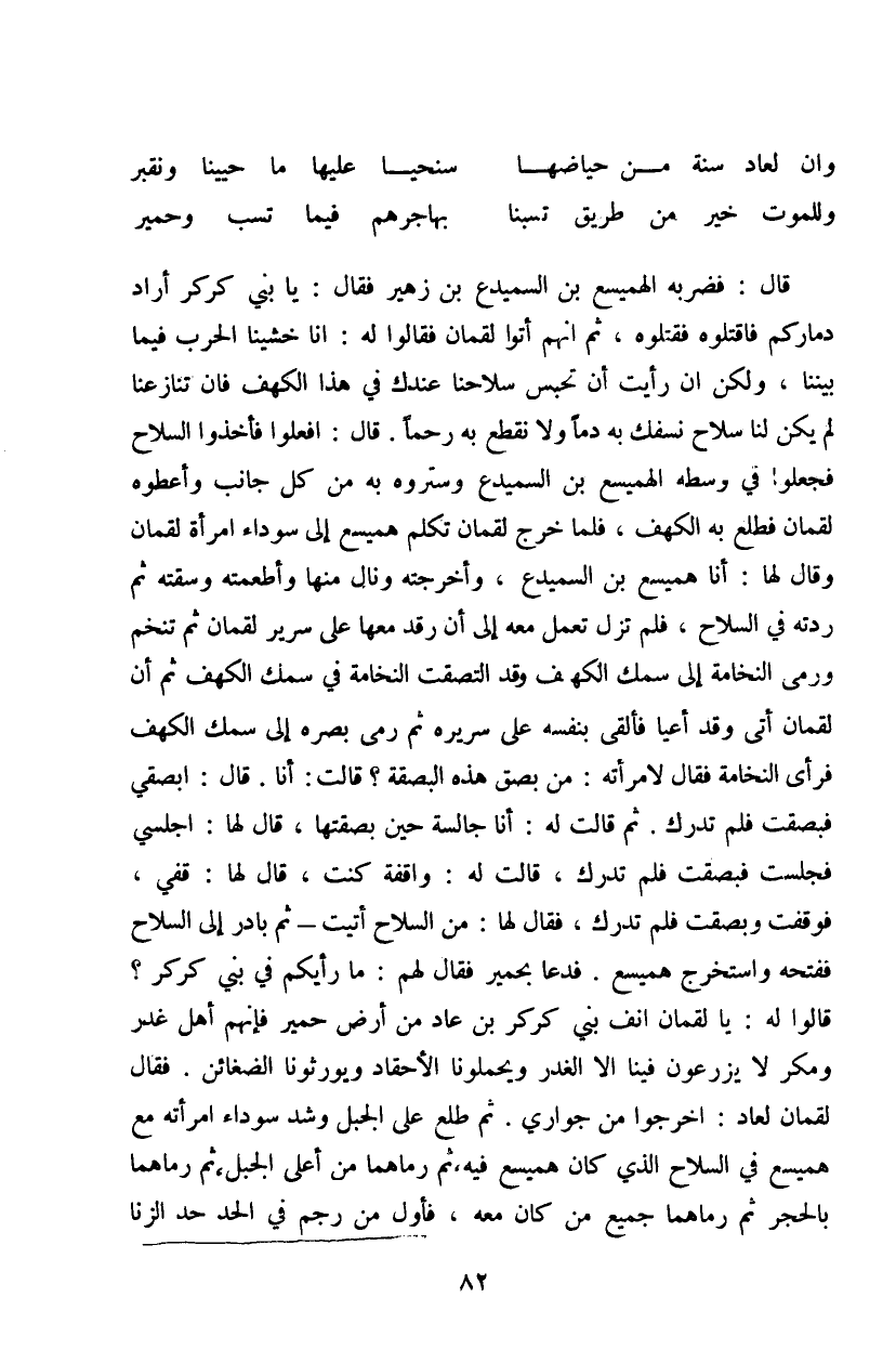 قال: فضربه الهميسع بن السميدع بن زهير فقال: يا بني كركر أراد دماركم فاقتلوه فقتلوه ثم إنهم أتوا لقمان فقالوا له: إنا خشينا الحرب فيما بيننا، ولكن إن رأيت أن تحبس سلاحنا عندك في هذا الكهف فإن تنازعنا لم يكن لنا سلاح نسفك به دماً ولا نقطع به رحماً. قال: افعلوا فأخذوا السلاح فجعلوا في وسطه الهمسيع بن السميدع وستروه به من كل جانب وأعطوه لقمان فطلع به الكهف، فلما خرج لقمان تكلم همسيع إلى سوداء امرأة لقمان وقال لها: أنا همسيع بن السميدع، وأخرجته ونال منها وأطعمته وسقته ثم ردته في السلاح، فلم تزل تعمل معه إلى أن رقد معها على سرير لقمان ثم تنخم ورمى النخامة إلى سمك الكهف وقد التصقت النخامة في سمك الكهف ثم أن لقمان أتى وقد أعيا فألقى بنفسه على سريره ثم رمى بصره إلى سمك الكهف فرأى النخامة فقال لامرأته: من بصق هذه البصقة؟ قالت: أنا. قال: ابصقي فبصقت فلم تدرك. ثم قالت له: أنا جالسة حين بصقتها، قال لها: اجلسي فجلست فبصقت فلم تدرك، قالت له: واقفة كنت، قال لها: قفي، فوقفت وبصقت فلم تدرك، فقال لها: من السلاح أتيت - ثم بادر إلى السلاح ففتحه واستخرج همسيع. فدعا بحمير فقال لهم: ما رأيكم في بني كركر؟ قالوا له: يا لقمان انف بني كركر بن عاد من أرض حمير فإنهم أهل غدر ومكر لا يزرعون فينا إلا الغدر ويحملونا الأحقاد ويورثونا الضغائن. فقال لقمان لعاد: اخرجوا من جواري. ثم طلع على الجبل وشد سوداء امرأته مع همسيع في السلاح الذي كان همسيع فيه، ثم رماهما من أعلى الجبل، ثم رماهما بالحجر ثم رماهما جميع من كان معه، فأول من رجم في الحد حد الزنا