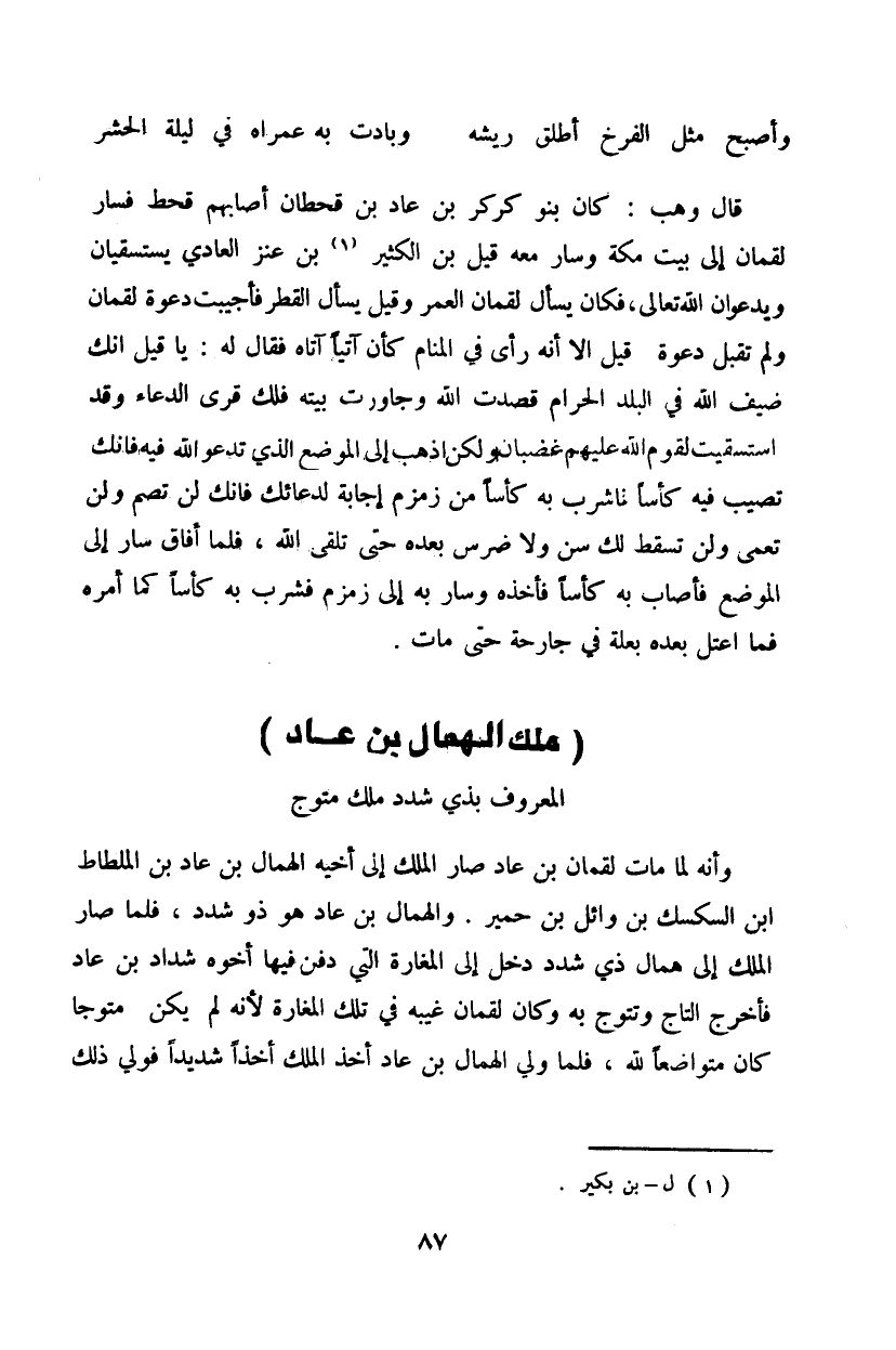 وأنه لما مات لقمان بن عاد صار الملك إلى أخيه الهمال بن عاد بن الملطاط ابن السكسك بن وائل بن حمير. والهمال بن عاد هو ذو شدد، فلما صار الملك إلى هم الذي شدد دخل إلى المغارة التي دفن فيها أخوه شداد بن عاد فأخرج التاج وتتوج به وكان لقمان غيبه في تلك المغارة لأنه لم يكن متوجا كان متواضعاً لله، فلما ولي الهمال بن عاد أخذ الملك أخذاً شديداً فولي ذلك