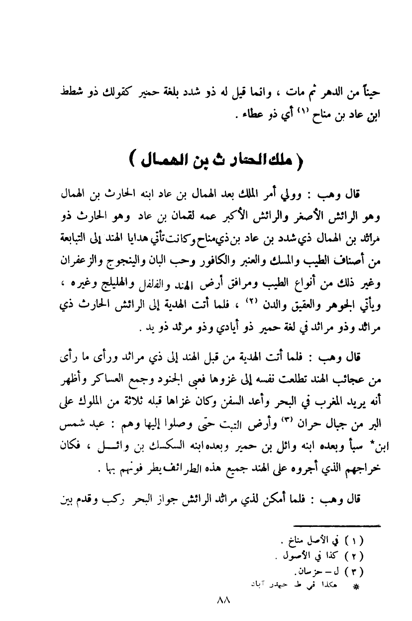 قال وهب: وولي أمر الملك بعد الهمال بن عاد ابنه الحارث بن الهمال وهو الرائش الأصغر والرائش الأكبر عنه لقمان بن عاد وهو الحارث ذو مراثد بن الهمال ذي شدد بن عاد بن ذي مناخ وكانت تأتي هدايا الهند إلى التبابعة من أصناف الطيب والمسك والعنبر والكافور وحب البان والينجوج والزعفران وغير ذلك من أنواع الطيب ومرافق أرض الهند والفلفل والهليلج وغيره، ويأتي الجوهر والعقيق والدن، فلما أتت الهدية إلى الرائش الحارث ذي مراثد وذو مراثد في لغة حمير ذو أيادي وذو مرثد ذو يد.