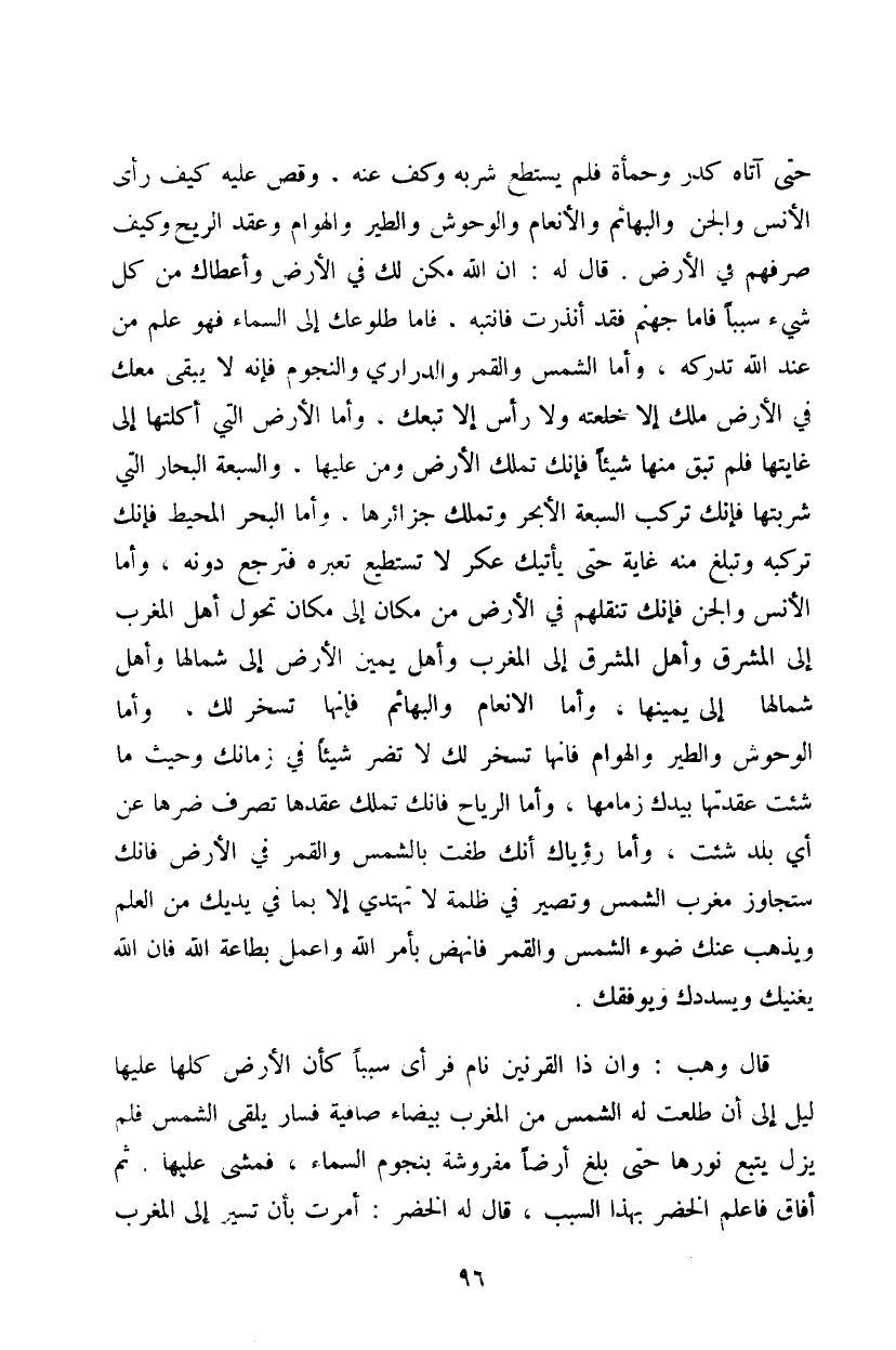 حتى آتاه كدر وحمأة فلم يستطع شربه وكف عنه. وقص عليه كيف رأى الأنس والجن والبهائم والأنعام والوحوش والطير والهوام وعقد الريح وكيف صرفهم في الأرض. قال له: أن الله مكن لك في الأرض وأعطاك من كل شيء سببا فأما جهنم فقد أنذرت فانتبه. فأما طلوعك إلى السماء فهو علم من عند الله تدركه، وأما الشمس والقمر والدراري والنجوم فإنه لا يبقى معك في الأرض ملك إلا خلعته ولا رأس إلا تبعك. وأما الأرض التي أكلتها إلى غايتها فلم تبق منها شيئاً فإنك تملك الأرض ومن عليها. والسبعة البحار التي شربتها فإنك تركب السبعة الأبحر وتملك جزائرها. وأما البحر المحيط فإنك تركبه وتبلغ منه غاية يأتيك عكر لا تستطيع تعبره فترجع دونه، وأما الأنس والجن فإنك تنقلهم في الأرض من مكان إلى مكان تحول أهل المغرب إلى المشرق وأهل المشرق إلى المغرب وأهل يمين الأرض إلى شمالها وأهل شمالها إلى يمينها، وأما الأنعام والبهائم فإنها تسخر لك. وأما الوحوش والطير والهوام فإنها تسخر لك لا تضر شيئاً في زمانك وحيث ما شئت عقدتها بيدك زمامها، وأما الرياح فانك تملك عقدها تصرف ضرها عن أي بلد شئت، وأما رؤياك أنك طفت بالشمس والقمر في الأرض فانك ستجاوز مغرب الشمس وتصير في ظلمة لا تهتدي إلا بما في يديك من العلم ويذهب عنك ضوء الشمس والقمر فانهض بأمر الله واعمل بطاعة الله فإن الله يغنيك ويسددك ويوفقك.