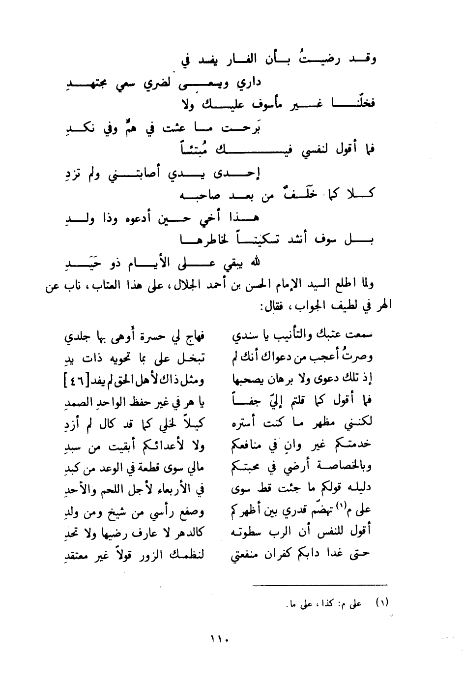 وَلما اطلع السَّيِّد الإِمَام الْحسن بن أَحْمد الْجلَال على هَذَا العتاب نَاب عَن الهر فِي لطيف الْجَواب فَقَالَ
