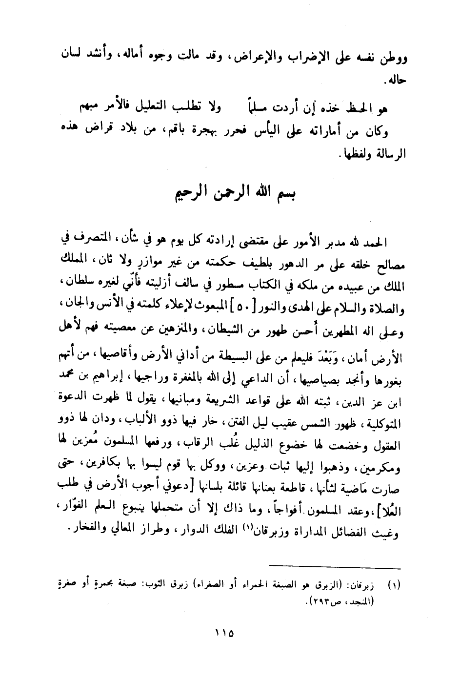 الْحَمد لله مُدبر الْأُمُور على مُقْتَضى إِرَادَته كل يَوْم هُوَ فِي شَأْن الْمُتَصَرف فِي مصَالح خلقه على مر الدهور بلطيف حكمته من غير موازر وَلَا ثَان المملك الْملك من عبيده من ملكه فِي الْكتاب مسطور فِي سالف أزليته فَأَنِّي لغيره سُلْطَان وَالصَّلَاة وَالسَّلَام على الْهدى والنور الْمَبْعُوث لإعلاء كَلمته فِي الْأنس والجان وعَلى اله المطهرين أحسن طهُور من الشَّيْطَان والمنزهين عَن مَعْصِيَته فهم لأهل الأَرْض أَمَان وَبعد فَليعلم من على البسيطة من أداني الأَرْض وأقاصيها من أتهم بغورها وأنجد بصياصيها أَن الدَّاعِي إِلَى الله بالمغفرة وراجيها إِبْرَاهِيم بن مُحَمَّد ابْن عز الدّين ثبته الله على قَوَاعِد الشَّرِيعَة ومبانيها يَقُول لما ظَهرت الدعْوَة المتوكلية ظُهُور الشَّمْس عقيب ليل الْفِتَن خار فِيهَا ذَوُو الْأَلْبَاب ودان لَهَا ذَوُو الْعُقُول وخضعت لَهَا خضوع الذَّلِيل غلب الرّقاب ورفعها الْمُسلمُونَ معزين لَهَا ومكرمين وذهبوا إِلَيْهَا ثبات وعزين ووكل بهَا قوم لَيْسُوا بهَا بكافرين حَتَّى صَارَت مَاضِيَة لشأنها قَاطِعَة بعنانها قائلة بلسانها دَعونِي أجوب الأَرْض فِي طلب الْعلَا وَعقد الْمُسلمُونَ أَفْوَاجًا وَمَا ذَاك إِلَّا أَن متحملها ينبوع الْعلم الفوار وغيث الْفَضَائِل المداراة وزبرقان الْفلك الدوار وطراز الْمَعَالِي والفخار