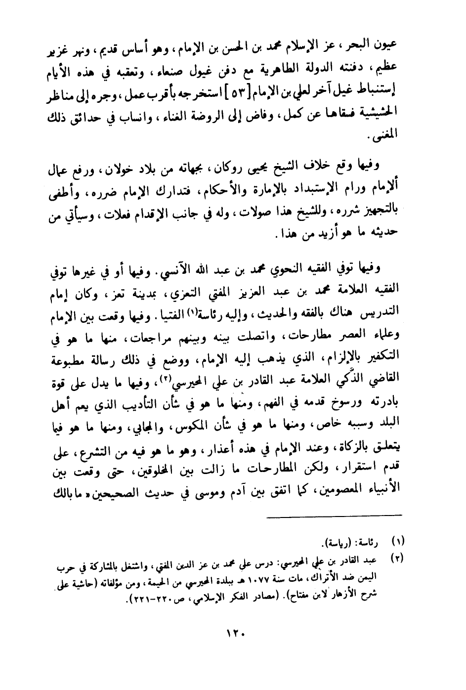 وفيهَا توفّي الْفَقِيه النَّحْوِيّ مُحَمَّد بن عبد الله الآنسي وفيهَا أَو فِي غَيرهَا توفّي الْفَقِيه الْعَلامَة مُحَمَّد بن عبد الْعَزِيز الْمُفْتِي التعزي بِمَدِينَة تعز وَكَانَ إِمَام التدريس هُنَاكَ بالفقه والْحَدِيث وَإِلَيْهِ رئاسة الْفتيا وفيهَا وَقعت بَين الإِمَام وعلماء الْعَصْر مطارحات واتصلت بَينه وَبينهمْ مراجعات مِنْهَا مَا هُوَ فِي التَّكْفِير بالإلزام الَّذِي يذهب إِلَيْهِ الإِمَام وَوضع فِي ذَلِك رِسَالَة مطبوعة القَاضِي الذكي الْعَلامَة عبد الْقَادِر بن عَليّ المحيرسي وفيهَا مَا يدل على قُوَّة بادرته ورسوخ قدمه فِي الْفَهم وَمِنْهَا مَا هُوَ فِي شَأْن التَّأْدِيب الَّذِي يعم أهل الْبَلَد وَسَببه خَاص وَمِنْهَا مَا هُوَ فِي شَأْن المكوس والمجابي وَمِنْهَا مَا هُوَ فِيمَا يتَعَلَّق بِالزَّكَاةِ وَعند الإِمَام فِي هَذِه أعذار وَهُوَ مَا هُوَ فِيهِ من التشرع على قدم اسْتِقْرَار وَلَكِن المطارحات مَا زَالَت بَين المخلوقين حَتَّى وَقعت بَين الْأَنْبِيَاء المعصومين كَمَا اتّفق بَين آدم ومُوسَى فِي حَدِيث الصَّحِيحَيْنِ مَا بالك