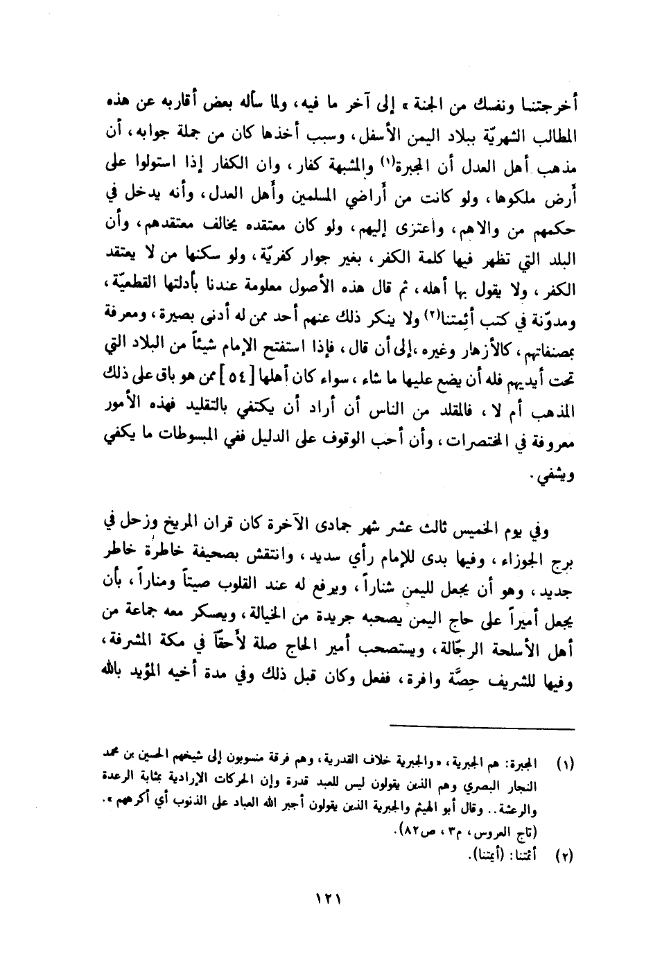 أخرجتنا ونفسك من الْجنَّة إِلَى آخر مَا فِيهِ وَلما سَأَلَهُ بعض أَقَاربه عَن هَذِه المطالب الشهرية بِبِلَاد الْيمن الْأَسْفَل وَسبب أَخذهَا كَانَ من جملَة جَوَابه أَن مَذْهَب أهل الْعدْل أَن المجيرة والمشبهة كفار وان الْكفَّار إِذا استولوا على أَرض ملكوها وَلَو كَانَت من أَرَاضِي الْمُسلمين وَأهل الْعدْل وَأَنه يدْخل فِي حكمهم من والاهم واعتزى إِلَيْهِم وَلَو كَانَ معتقده يُخَالف معتقدهم وَأَن الْبَلَد الَّتِي تظهر فِيهَا كلمة الْكفْر بِغَيْر جوَار كفرية وَلَو سكنها من لَا يعْتَقد الْكفْر وَلَا يَقُول بهَا أَهله ثمَّ قَالَ هَذِه الْأُصُول مَعْلُومَة عندنَا بأدلتها القطعية ومدونة فِي كتب أَئِمَّتنَا وَلَا يُنكر ذَلِك عَنْهُم أحد مِمَّن لَهُ أدنى بَصِيرَة وَمَعْرِفَة بمصنفاتهم كالأزهار وَغَيره إِلَى أَن قَالَ فَإِذا استفتح الْأَمَام شَيْئا من الْبِلَاد الَّتِي تَحت أَيْديهم فَلهُ أَن يضع عَلَيْهَا مَا شَاءَ سَوَاء كَانَ أَهلهَا 54 مِمَّن هُوَ بَاقٍ على ذَلِك الْمَذْهَب أم لَا فالمقلد من النَّاس أَن أَرَادَ أَن يَكْتَفِي بالتقليد فَهَذِهِ الْأُمُور مَعْرُوفَة فِي المختصرات وَأَن أحب الْوُقُوف على الدَّلِيل فَفِي المبسوطات مَا يَكْفِي ويشفي