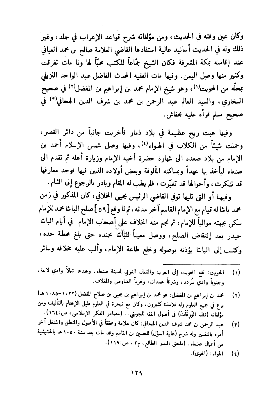 وَكَانَ عين وقته فِي الحَدِيث وَمن مؤلفاته شرح قَوَاعِد الْإِعْرَاب فِي جلد وَغير ذَلِك وَله فِي الحَدِيث أَسَانِيد عالية استفادها القَاضِي الْعَلامَة صَالح بن مُحَمَّد العياني عِنْد إِقَامَته بِمَكَّة المشرفة فَكَانَ الشَّيْخ جماعا للكتب محبا لَهَا وَلما مَاتَ تَفَرَّقت وَكثير مِنْهَا وصل الْيمن وفيهَا مَاتَ الْفَقِيه الْمُحدث الْفَاضِل عبد الْوَاحِد النزيلي بمحله من المحويت وَهُوَ شيخ الإِمَام مُحَمَّد بن إِبْرَاهِيم بن الْمفضل فِي صَحِيح البُخَارِيّ وَالسَّيِّد الْعَالم عبد الرَّحْمَن بن مُحَمَّد بن شرف الدّين الجحافي فِي صَحِيح مُسلم قَرَأَهُ عَلَيْهِ بحفاش