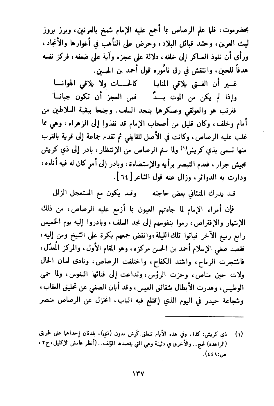 فترتب هُوَ والعولقي وعسكرهما بِنَجْد السّلف وجنحا بِبَقِيَّة السلاطين من أَمَام وَخلف وَكَانَ قَلِيل من أَصْحَاب الإِمَام قد نفذوا إِلَى الزهراء وَهِي مِمَّا غلب عَلَيْهِ الرصاص وَكَانَت فِي الأَصْل للقايفي ثمَّ تقدم جمَاعَة إِلَى قَرْيَة بِالْقربِ مِنْهَا تسمى بِذِي كريش وَلما سئم الرصاص من الإنتظار بَادر إِلَى ذِي كريش بِجَيْش جرار فَعدم التبصر بِرَأْيهِ والإستضاءة وبادر إِلَى أَمر كَانَ لَهُ فِيهِ أناءه ودارت بِهِ الدَّوَائِر وَزَالَ عَنهُ قَول الشَّاعِر