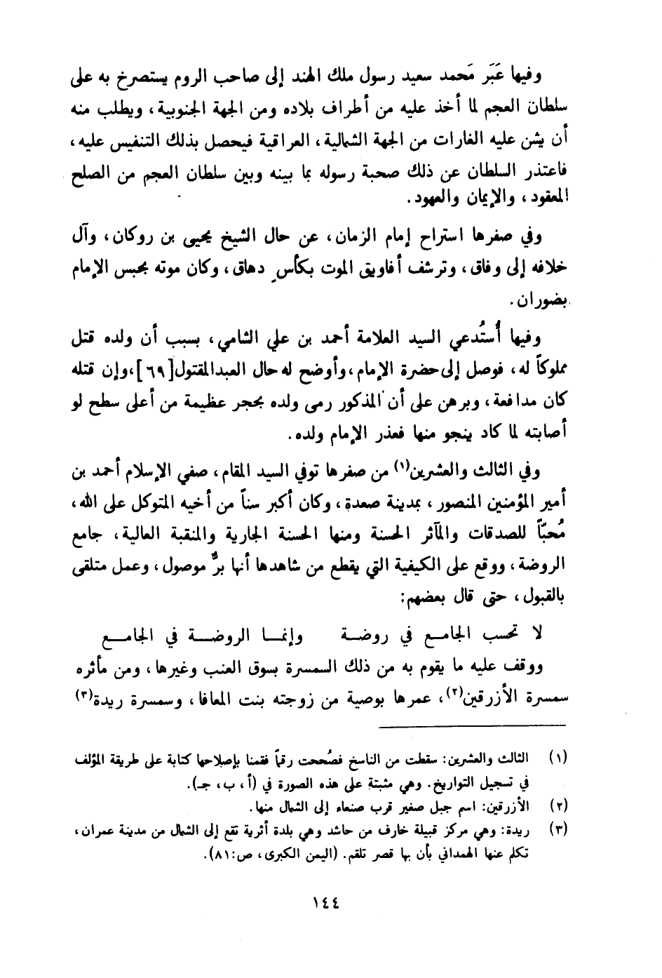 وَفِي الثَّالِث وَالْعِشْرين من صفرها توفّي السَّيِّد الْمقَام صفي الْإِسْلَام أَحْمد بن أَمِير الْمُؤمنِينَ الْمَنْصُور بِمَدِينَة صعدة وَكَانَ أكبر سنا من أَخِيه المتَوَكل على الله محبا للصدقات والمآثر الْحَسَنَة وَمِنْهَا الْحَسَنَة الْجَارِيَة والمنقبة الْعَالِيَة جَامع الرَّوْضَة وَوَقع على الْكَيْفِيَّة الَّتِي يقطع من شَاهدهَا أَنَّهَا بر مَوْصُول وَعمل متلقى بِالْقبُولِ حَتَّى قَالَ بَعضهم