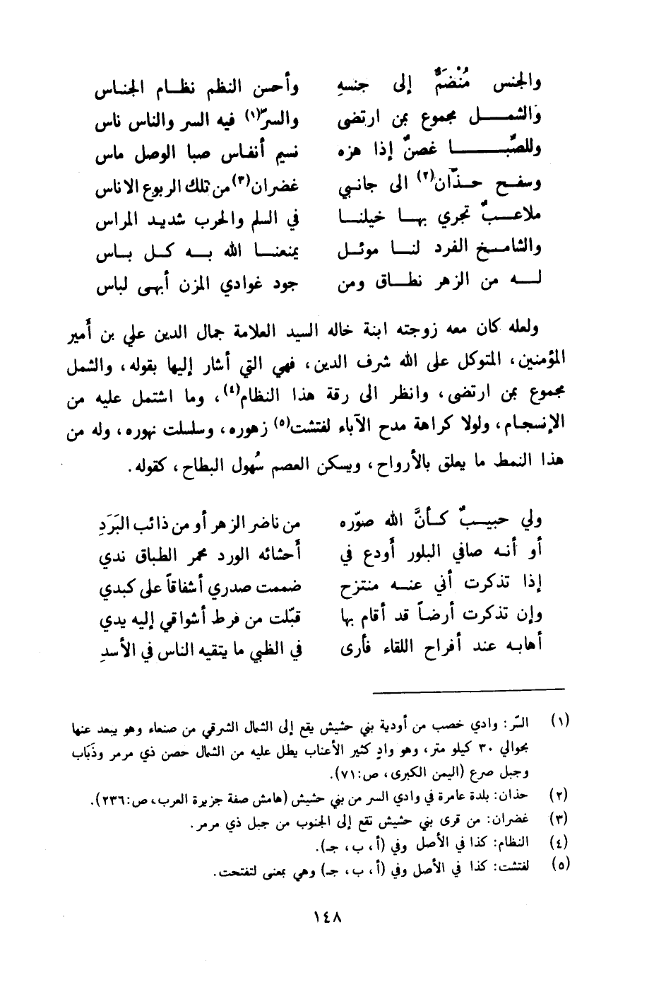 وَلَعَلَّه كَانَ مَعَه زَوجته ابْنة خَاله السَّيِّد الْعَلامَة جمال الدّين عَليّ بن أَمِير الْمُؤمنِينَ المتَوَكل على الله شرف الدّين فَهِيَ الَّتِي أَشَارَ إِلَيْهَا بقوله والشمل مَجْمُوع بِمن ارتضى وَانْظُر الى رقة هَذَا النظام وَمَا اشْتَمَل عَلَيْهِ من الإنسجام وَلَوْلَا كَرَاهَة مدح الْآبَاء لفتشت زهوره وسلسلت نهوره وَله من هَذَا النمط مَا يعلق بالأرواح ويسكن العصم سهول البطاح كَقَوْلِه