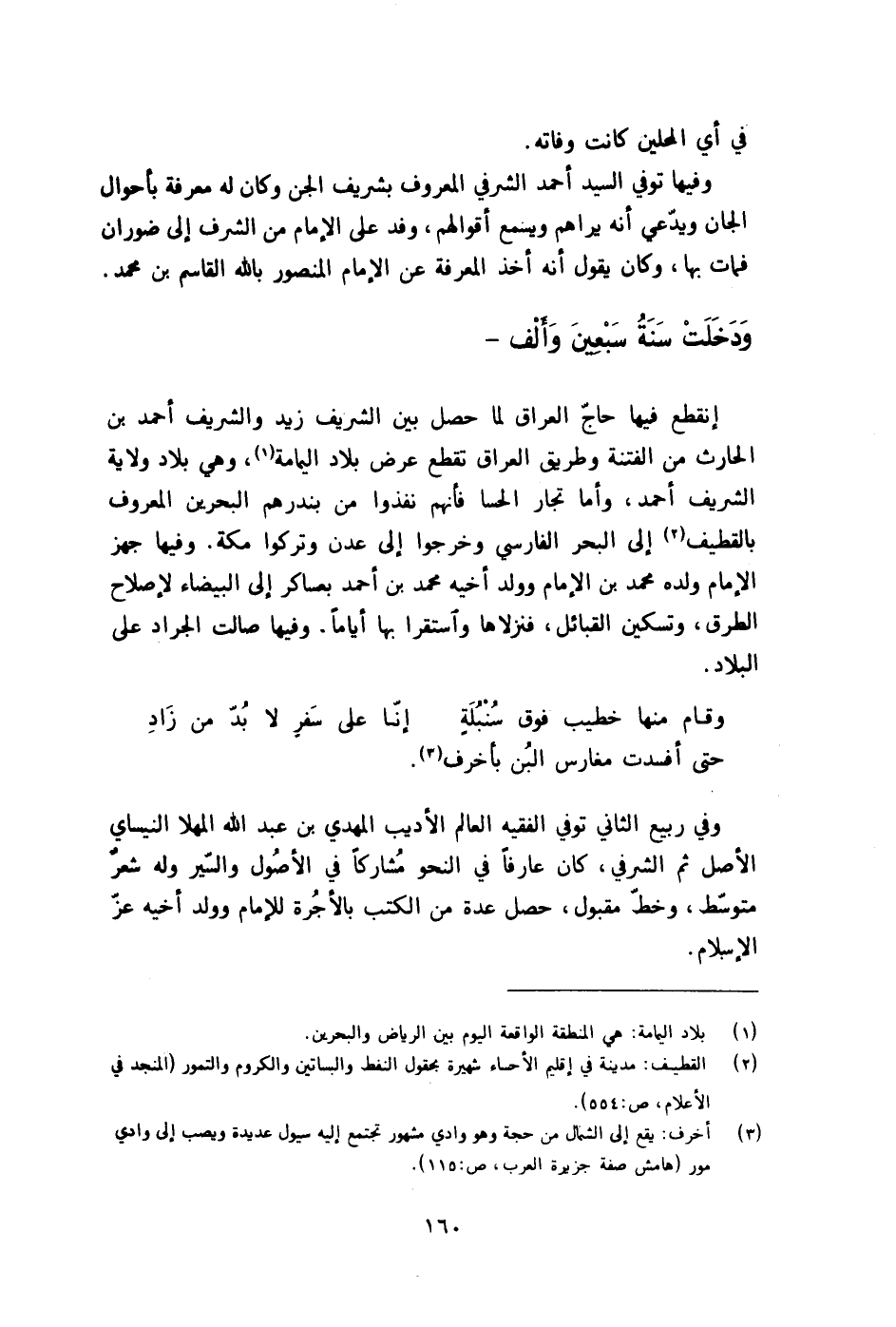إنقطع فِيهَا حَاج الْعرَاق لما حصل بَين الشريف زيد والشريف أَحْمد بن الْحَارِث من الْفِتْنَة وَطَرِيق الْعرَاق تقطع عرض بِلَاد الْيَمَامَة وَهِي بِلَاد ولَايَة الشريف أَحْمد وَأما تجار الحسا فأنهم نفذوا من بندرهم الْبَحْرين الْمَعْرُوف بالقطيف إِلَى الْبَحْر الْفَارِسِي وَخَرجُوا إِلَى عدن وَتركُوا مَكَّة وفيهَا جهز الإِمَام وَلَده مُحَمَّد بن الإِمَام وَولد أَخِيه مُحَمَّد بن أَحْمد بعساكر إِلَى الْبَيْضَاء لإِصْلَاح الطّرق وتسكين الْقَبَائِل فنزلاها واستقرا بهَا أَيَّامًا وفيهَا صالت الْجَرَاد على الْبِلَاد