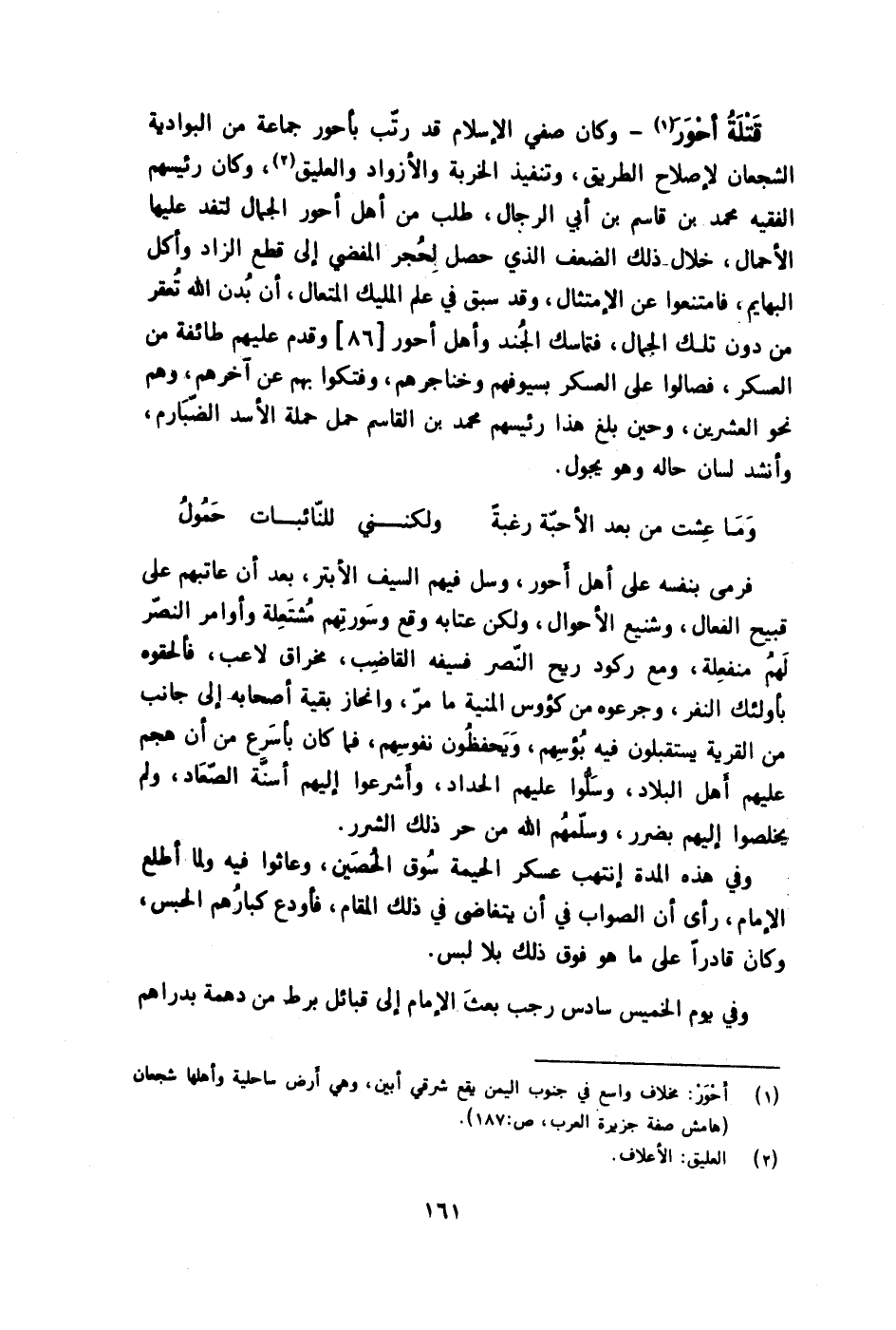 قتلة أحور وَكَانَ صفي الْإِسْلَام قد رتب بأحور جمَاعَة من البوادية الشجعان لإِصْلَاح الطَّرِيق وتنفيذ الخربة والأزواد والعليق وَكَانَ رئيسهم الْفَقِيه مُحَمَّد بن قَاسم بن أبي الرِّجَال طلب من أهل أحور الْجمال لتفد عَلَيْهَا الْأَحْمَال خلال ذَلِك الضعْف الَّذِي حصل لحجر المفضي إِلَى قطع الزَّاد وَأكل البهايم فامتنعوا عَن الإمتثال وَقد سبق فِي علم المليك المتعال أَن بدن الله تعقر من دون تِلْكَ الْجمال فتماسك الْجند وَأهل أحور وَقدم عَلَيْهِم طَائِفَة من الْعَسْكَر فصالوا على الْعَسْكَر بسيوفهم وخناجرهم وفتكوا بهم عَن آخِرهم وهم نَحْو الْعشْرين وَحين بلغ هَذَا رئيسهم مُحَمَّد بن الْقَاسِم حمل حَملَة الْأسد الضبارم وَأنْشد لِسَان حَاله وَهُوَ يجول