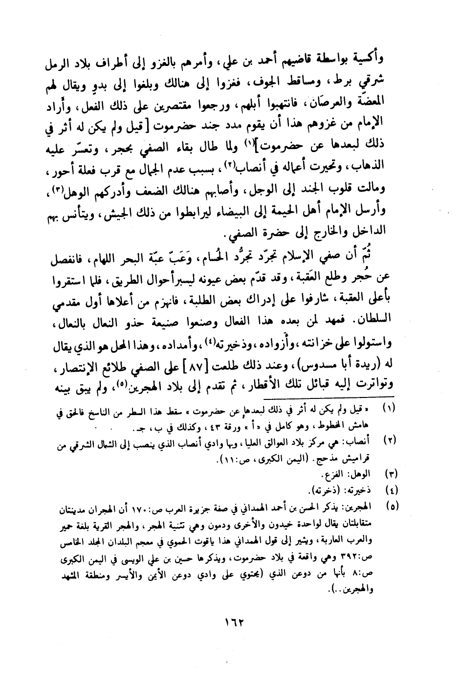 وأكسية بِوَاسِطَة قاضيهم أَحْمد بن عَليّ وَأمرهمْ بالغزو إِلَى أَطْرَاف بِلَاد الرمل شَرْقي برط ومساقط الْجوف فغزوا إِلَى هُنَالك وبلغوا إِلَى بَدو وَيُقَال لَهُم المعضة والعرصان فانتهبوا أبلهم وَرَجَعُوا مقتصرين على ذَلِك الْفِعْل وَأَرَادَ الإِمَام من غزوهم هَذَا أَن يقوم مدد جند حَضرمَوْت قيل وَلم يكن لَهُ أثر فِي ذَلِك لبعدها عَن حَضرمَوْت وَلما طَال بَقَاء الصفي بِحجر تعسر عَلَيْهِ الذّهاب وتحيرت أَعماله فِي أنصاب بِسَبَب عدم الْجمال مَعَ قرب فعلة أحور ومالت قُلُوب الْجند إِلَى الوجل وأصابهم هُنَالك الضعْف وأدركهم الوهل وَأرْسل الإِمَام أهل الحيمة إِلَى الْبَيْضَاء ليرابطوا من ذَلِك الْجَيْش ويتأنس بهم الدَّاخِل وَالْخَارِج إِلَى حَضْرَة الصفي