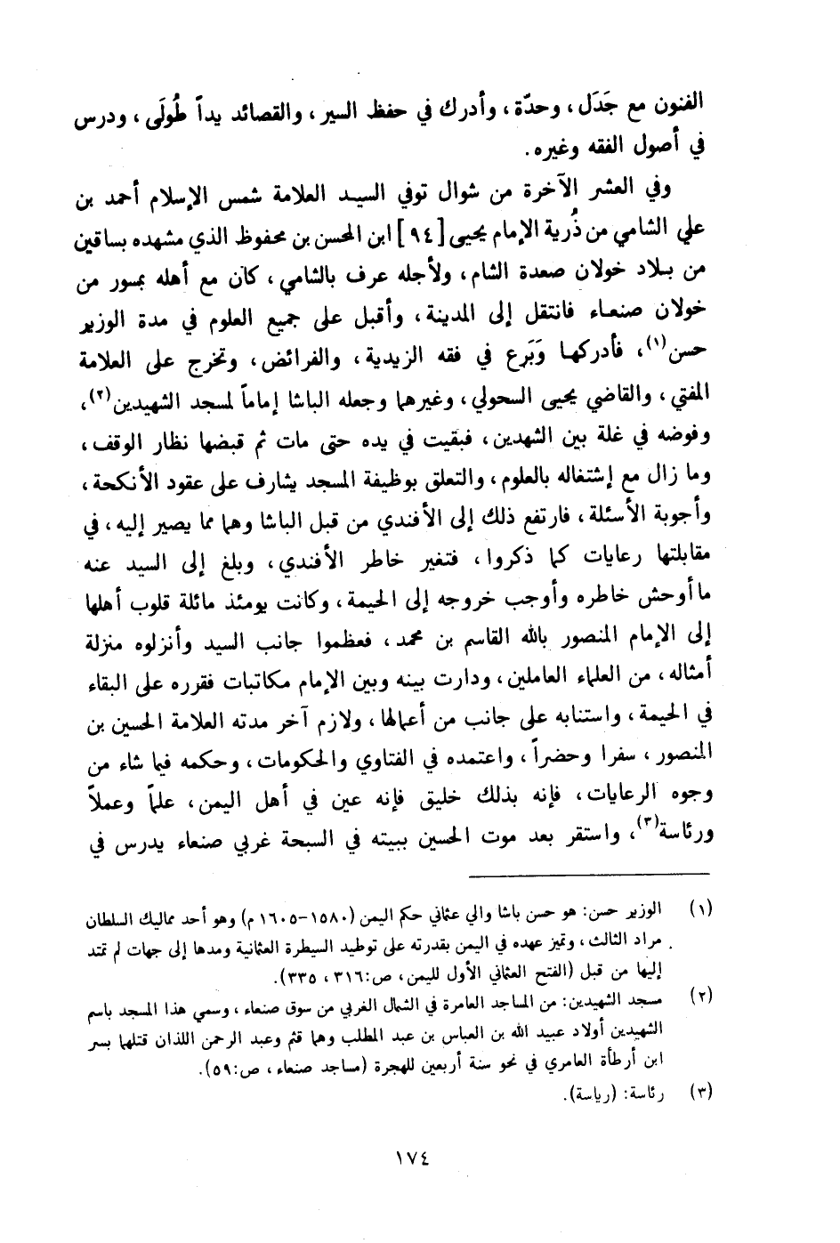 وَفِي الْعشْر الْآخِرَة من شَوَّال توفّي السَّيِّد الْعَلامَة شمس الْإِسْلَام أَحْمد بن عَليّ الشَّامي من ذُرِّيَّة الإِمَام يحيى ابْن المحسن بن مَحْفُوظ الَّذِي مشهده بساقين من بِلَاد خولان صعدة الشَّام ولأجله عرف بالشامي كَانَ مَعَ أَهله بمسور من خولان صنعاء فانتقل إِلَى الْمَدِينَة وَأَقْبل على جَمِيع الْعُلُوم فِي مُدَّة الْوَزير حسن فأدركها وبرع فِي فقه الزيدية والفرائض وَتخرج على الْعَلامَة الْمُفْتِي وَالْقَاضِي يحيى السحولي وَغَيرهمَا وَجعله الباشا إِمَامًا لمَسْجِد الشهيدين وفوضه فِي غلَّة بَين الشهدين فَبَقيت فِي يَده حَتَّى مَاتَ ثمَّ قبضهَا نظار الْوَقْف وَمَا زَالَ مَعَ إشتغاله بالعلوم والتعلق بوظيفة الْمَسْجِد يشارف على عُقُود الْأَنْكِحَة وأجوبة الأسئلة فارتفع ذَلِك إِلَى الأفندي من قبل الباشا وهما مِمَّا يصير إِلَيْهِ فِي مقابلتها رعايات كَمَا ذكرُوا فَتغير خاطر الأفندي وَبلغ إِلَى السَّيِّد عَنهُ مَا أوحش خاطره وَأوجب خُرُوجه إِلَى الحيمة وَكَانَت يَوْمئِذٍ مائلة قُلُوب أَهلهَا إِلَى الإِمَام الْمَنْصُور بِاللَّه الْقَاسِم بن مُحَمَّد فَعَظمُوا جَانب السَّيِّد وأنزلوه منزلَة أَمْثَاله من الْعلمَاء العاملين ودارت بَينه وَبَين الإِمَام مكاتبات فقرره على الْبَقَاء فِي الحيمة واستنابه على جَانب من أَعمالهَا ولازم آخر مدَّته الْعَلامَة الْحُسَيْن بن الْمَنْصُور سفرا وحضرا وَاعْتَمدهُ فِي الفتاوي والحكومات وَحكمه فِيمَا شَاءَ من وُجُوه الرعايات فَإِنَّهُ بذلك خليق فَإِنَّهُ عين فِي أهل الْيمن علما وَعَملا ورئاسة وَاسْتقر بعد موت الْحُسَيْن ببيته فِي السبحة غربي صنعاء يدرس فِي