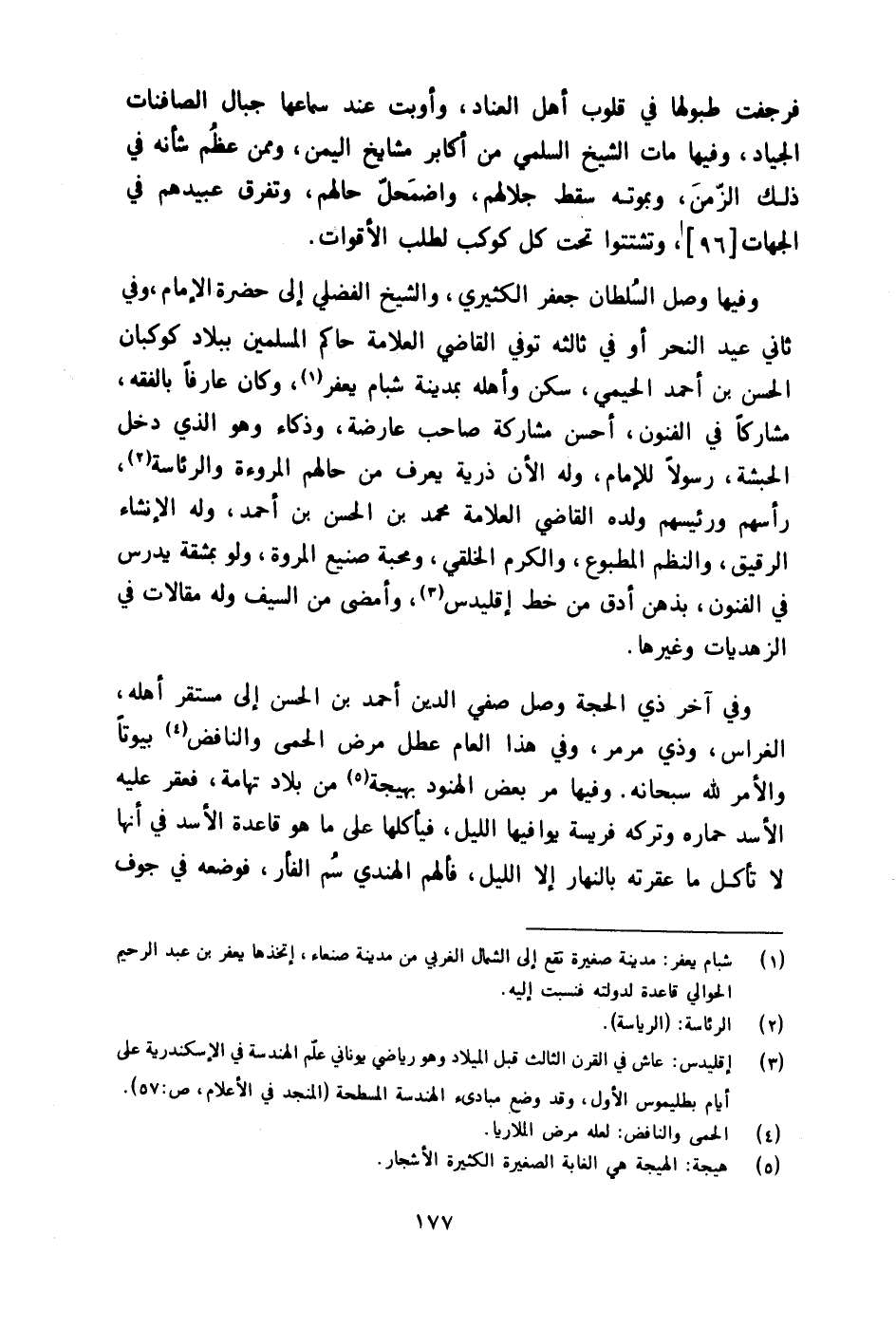 وفيهَا وصل السُّلْطَان جَعْفَر الكثيري وَالشَّيْخ الفضلي إِلَى حَضْرَة الإِمَام وَفِي ثَانِي عيد النَّحْر أَو فِي ثالثه توفّي القَاضِي الْعَلامَة حَاكم الْمُسلمين بِبِلَاد كوكبان الْحسن بن أَحْمد الحيمي سكن وَأَهله بِمَدِينَة شبام يعفر وَكَانَ عَارِفًا بالفقه مشاركا فِي الْفُنُون أحسن مُشَاركَة صَاحب عارضة وذكاء وَهُوَ الَّذِي دخل الْحَبَشَة رَسُولا للْإِمَام وَله الأن ذُرِّيَّة يعرف من حَالهم الْمُرُوءَة والرئاسة رَأْسهمْ وَرَئِيسهمْ وَلَده القَاضِي الْعَلامَة مُحَمَّد بن الْحسن بن أَحْمد وَله الْإِنْشَاء الرَّقِيق وَالنّظم المطبوع وَالْكَرم الخلقي ومحبة صَنِيع الْمَرْوَة وَلَو بِمَشَقَّة يدرس فِي الْفُنُون بذهن أدق من خطّ إقليدس وأمضى من السَّيْف وَله مقالات فِي الزهديات وَغَيرهَا