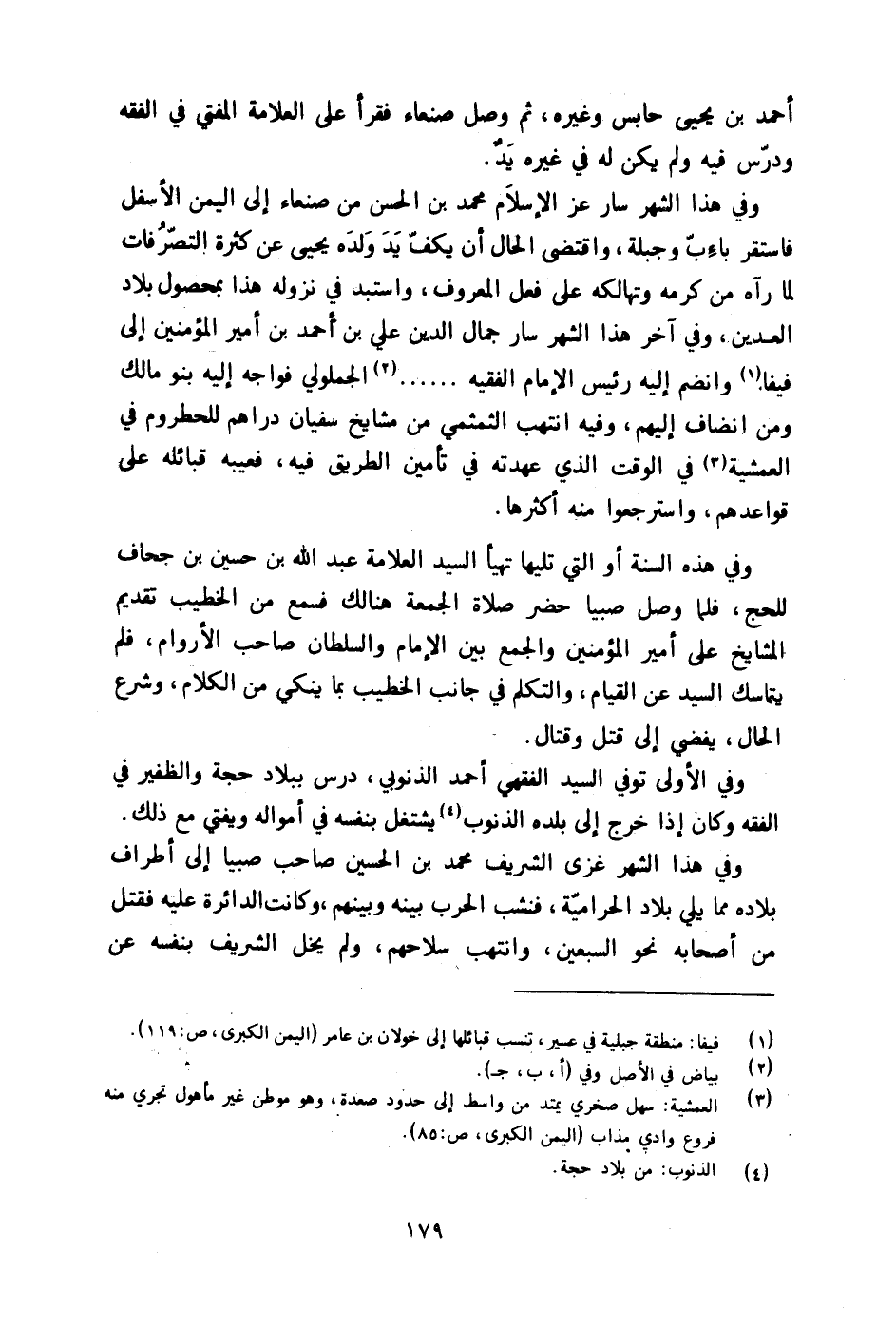 وَفِي هَذَا الشَّهْر سَار عز الْإِسْلَام مُحَمَّد بن الْحسن من صنعاء إِلَى الْيمن الْأَسْفَل فاستقر باءب وجبلة وَاقْتضى الْحَال أَن يكف يَد وَلَده يحيى عَن كَثْرَة التَّصَرُّفَات لما رَآهُ من كرمه وتهالكه على فعل الْمَعْرُوف واستبد فِي نُزُوله هَذَا بمحصول بِلَاد العدين وَفِي آخر هَذَا الشَّهْر سَار جمال الدّين عَليّ بن أَحْمد بن أَمِير الْمُؤمنِينَ إِلَى فيفا وانضم إِلَيْهِ رَئِيس الإِمَام الْفَقِيه الجملولي فواجه إِلَيْهِ بَنو مَالك وَمن انضاف إِلَيْهِم وَفِيه انتهب الثمثمي من مَشَايِخ سُفْيَان دَرَاهِم للحطروم فِي العمشية فِي الْوَقْت الَّذِي عهدته فِي تَأْمِين الطَّرِيق فِيهِ فعيبه قبائله على قواعدهم واسترجعوا مِنْهُ أَكْثَرهَا