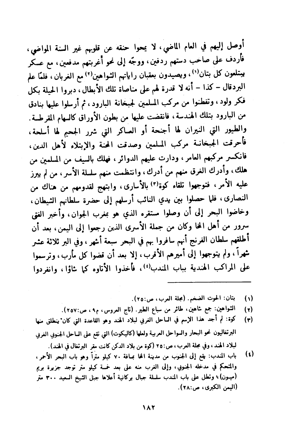 أوصل إِلَيْهِم فِي الْعَام الْمَاضِي لَا يمحوا حنقه عَن قُلُوبهم غير السّنة المواضي فَأرْدف على صَاحب دستهم ردفين وَوجه إِلَى نَحْو أغربتهم مدفعين مَعَ عَسْكَر يبتلعون كل بتان ويصيدون بعقبان راياتهم الشواهين مَعَ الْغرْبَان فَلَمَّا علم البردقال كَذَا أَنه لَا قدرَة لَهُم على مناصاة تِلْكَ الْأَبْطَال دبروا الْحِيلَة بِكُل فكر ولود وتفطنوا من مركب الْمُسلمين لجبخانة البارود ثمَّ أرْسلُوا عَلَيْهَا بَنَادِق من البارود بِتِلْكَ الهندسة فانقضت عَلَيْهَا من بطُون الأوراق كالسهام المقرطسة والطيور الَّتِي النيرَان لَهَا أَجْنِحَة أَو العساكر الَّتِي شرر الْجَحِيم لَهَا أسلحة فأحرقت الجبخانة مركب الْمُسلمين وصدقت المحنة والإبتلاء لأهل الدّين فانكسر مركبهم العامر ودارت عَلَيْهِم الدَّوَائِر فَهَلَك بِالسَّيْفِ من الْمُسلمين من هلك وَأدْركَ الْغَرق مِنْهُم من أدْرك وانتظمت مِنْهُم سلسلة الْأسر من لم يبرز عَلَيْهِ الْأَمر فتوجهوا تِلْقَاء كوَّة بالأسارى وابتهج لقدومهم من هُنَاكَ من النَّصَارَى فَلَمَّا حصلوا بَين يَدي النَّائِب أرسلهم إِلَى حَضْرَة سلطانهم الشَّيْطَان وخاضوا الْبَحْر إِلَى أَن وصلوا مستقره الَّذِي هُوَ بمغرب الجوان وَأخْبر الْفَتى سرُور من أهل المخا وَكَانَ من جملَة الأسرى الَّذين رجعُوا إِلَى الْيمن بعد أَن أطلقهُم سُلْطَان الفرنج أَنهم سافروا بهم فِي الْبَحْر سَبْعَة أشهر وَفِي الْبر ثَلَاثَة عشر شهرا وَلم يتوجهوا إِلَى أَمِيرهمْ الْأَقْرَب إِلَّا بعد أَن قضوا كل مأرب وترسموا على المراكب الْهِنْدِيَّة بِبَاب المندب فَأخذُوا الأتاوه كَمَا شاؤا وانفردوا