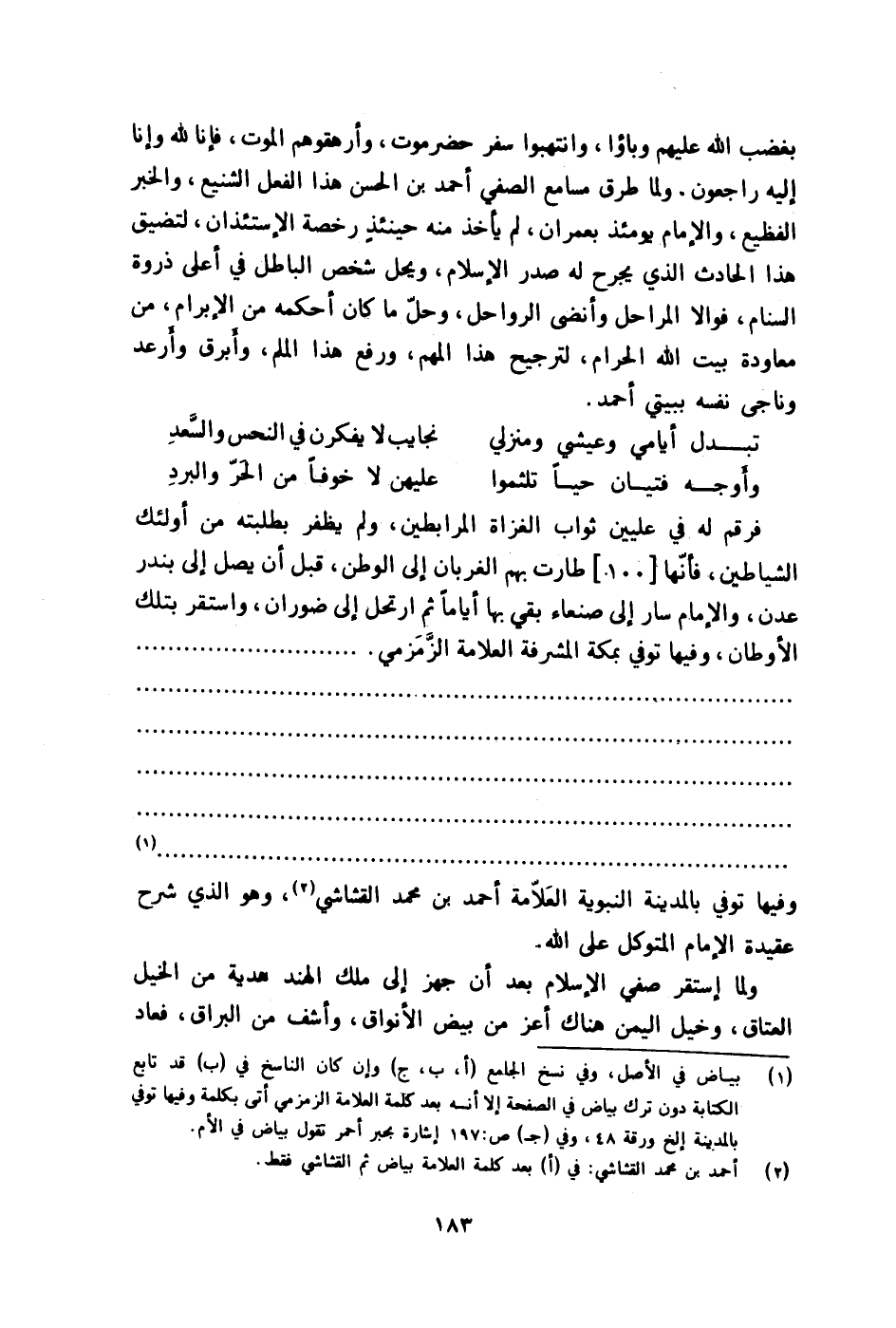 بغضب الله عَلَيْهِم وباؤا وانتهبوا سفر حَضرمَوْت وأرهقوهم الْمَوْت فَإنَّا لله وَإِنَّا إِلَيْهِ رَاجِعُون وَلما طرق مسامع الصفي أَحْمد بن الْحسن هَذَا الْفِعْل الشنيع وَالْخَبَر الفظيع وَالْإِمَام يَوْمئِذٍ بعمران لم يَأْخُذ مِنْهُ حِينَئِذٍ رخصَة الإستئذان لتضيق هَذَا الْحَادِث الَّذِي يجرح لَهُ صدر الْإِسْلَام وَيحل شخص الْبَاطِل فِي أَعلَى ذرْوَة السنام فوالا المراحل وأنضى الرَّوَاحِل وَحل مَا كَانَ أحكمه من الإبرام من معاودة بَيت الله الْحَرَام لترجيح هَذَا المهم وَرفع هَذَا الملم وأبرق وأرعد وناجى نَفسه ببيتي أَحْمد