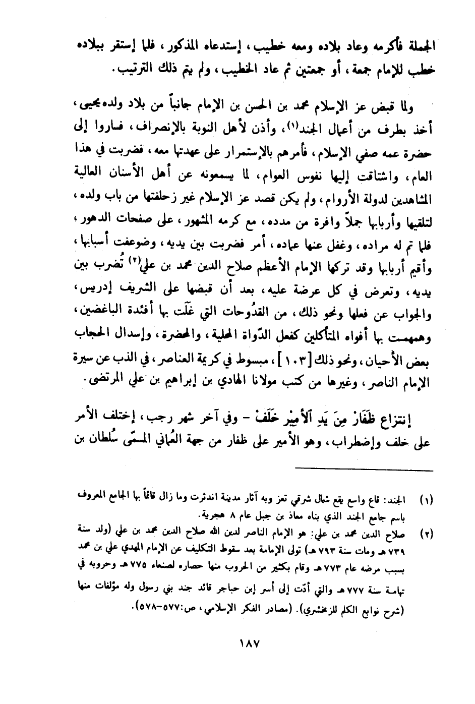 وَلما قبض عز الْإِسْلَام مُحَمَّد بن الْحسن بن الإِمَام جانبا من بِلَاد وَلَده يحيى أَخذ بِطرف من أَعمال الْجند وَأذن لأهل النّوبَة بالإنصراف فَسَارُوا إِلَى حَضْرَة عَمه صفي الْإِسْلَام فَأَمرهمْ بالإستمرار على عهدتها مَعَه فَضربت فِي هَذَا الْعَام واشتاقت إِلَيْهَا نفوس الْعَوام لما يسمعونه عَن أهل الْأَسْنَان الْعَالِيَة المشاهدين لدولة الأروام وَلم يكن قصد عز الْإِسْلَام غير زحلفتها من بَاب وَلَده لتلقيها وأربابها جملا وافرة من مدده مَعَ كرمه الْمَشْهُور على صفحات الدهور فَلَمَّا تمّ لَهُ مُرَاده وغفل عَنْهَا عماده أَمر فَضربت بَين يَدَيْهِ وضوعفت أَسبَابهَا وأقيم أَرْبَابهَا وَقد تَركهَا الإِمَام الْأَعْظَم صَلَاح الدّين مُحَمَّد بن عَليّ تضرب بَين يَدَيْهِ وَتعرض فِي كل عرضة عَلَيْهِ بعد أَن قبضهَا على الشريف إِدْرِيس وَالْجَوَاب عَن فعلهَا وَنَحْو ذَلِك من القدوحات الَّتِي غلت بهَا أَفْئِدَة الباغضين وهمهمت بهَا أَفْوَاه المتأكلين كَفعل الدواة الْمَحَلِّيَّة والمحضرة وإسدال الْحجاب بعض الأحيان وَنَحْو ذَلِك مَبْسُوط فِي كَرِيمَة العناصر فِي الذب عَن سيرة الإِمَام النَّاصِر وَغَيرهَا من كتب مَوْلَانَا الْهَادِي بن إِبْرَاهِيم بن عَليّ المرتضى