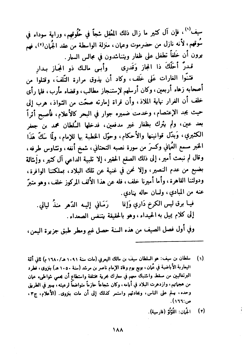 سيف فَإِن آل كثير مَا زَالَ ذَلِك المعقل شجا فِي حُلُوقهمْ وَرَايَة سَوْدَاء فِي سوقهم لِأَنَّهُ نَازل من حَضرمَوْت وعمان منزلَة الْوَاسِطَة من عقد الجمان فهم يرَوْنَ أَن خلفا تطفل على ظفار ويتناشدون فِي مجَالِس السمار