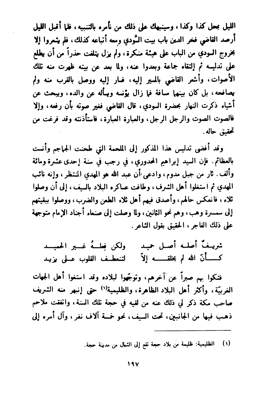 وَقد أفْضى تَدْلِيس هَذَا الْمَذْكُور إِلَى الملحمة الَّتِي طحنت الجماجم وأنست بالعظائم فَإِن السَّيِّد إِبْرَاهِيم المحدوري فِي رَجَب فِي سنة إِحْدَى عشرَة وَمِائَة وَألف ثار من جبل مدوم وَادّعى أَن عبد الله هُوَ الْمهْدي المنتظر وَإنَّهُ نَائِب الْمهْدي ثمَّ استغلوا أهل الشّرف وطافت عساكره الْبِلَاد بِالسَّيْفِ إِلَى أَن وصلوا ثلاء فانعكس حَالهم وأصدق فيهم أهل ثلاء الطعْن وَالضَّرْب ووصلوا ببقيتهم إِلَى سمسرة وهب وهم نَحْو الثَّمَانِينَ وَلما وصلت إِلَى صنعاء أجناد الإِمَام متوجهة على ذَلِك الْفَاجِر الْحقيق بقول الشَّاعِر