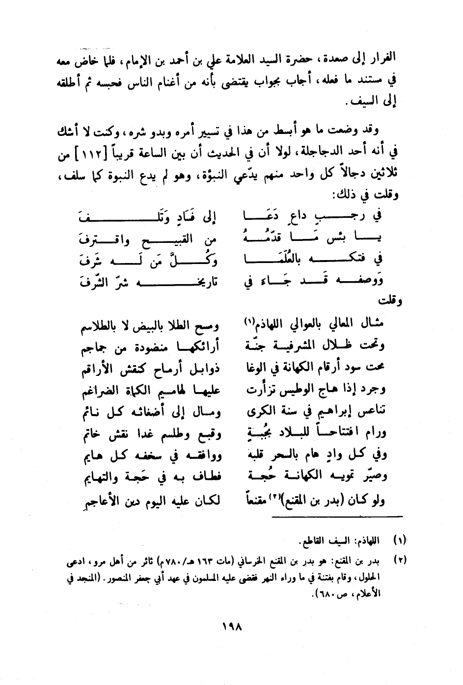 (وَلَو كَانَ (بدر بن الْمقنع) مقنعا ... لَكَانَ عَلَيْهِ الْيَوْم دين الْأَعَاجِم)